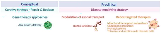 Redox-targeted therapies represent a more conceptual and supportive strategy aimed at mitigating downstream consequences of GDAP1 dysfunction. Given the proposed role of GDAP1 as a redox sensor, antioxidant-based approaches—such as mitochondria-targeted antioxidants (e.g., MitoQ) [105], glutathione precursors, N-acetylcysteine, thiamine and nicotinamide riboside (NR) [106], or small molecules enhancing endogenous antioxidant defenses—may mitigate oxidative stress and partially normalize organelle morphology and neuronal function.