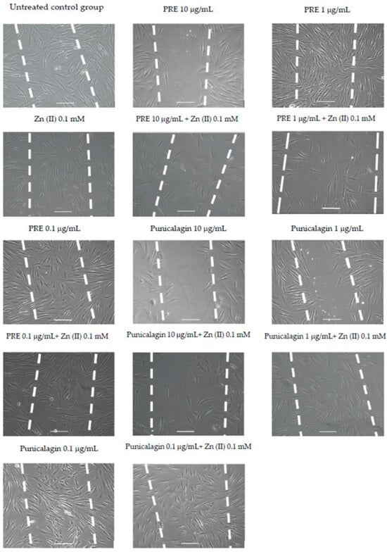 Representative time-lapse microscopy images of gingival fibroblast migration and wound repopulation at 48 h, following treatment with PRE and punicalagin (0.1–10 μg/mL) alone and with 0.1 mM Zn (II), White dashed lines show original scratch wounds at 0 h. Scale bar = 100 μm.