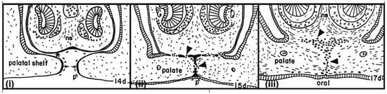 | Secondary palate (fusion of palatal shelves) | [130,152,155,156,157,158,159,160,161,162,163,164,165,166] (Figure 3) |