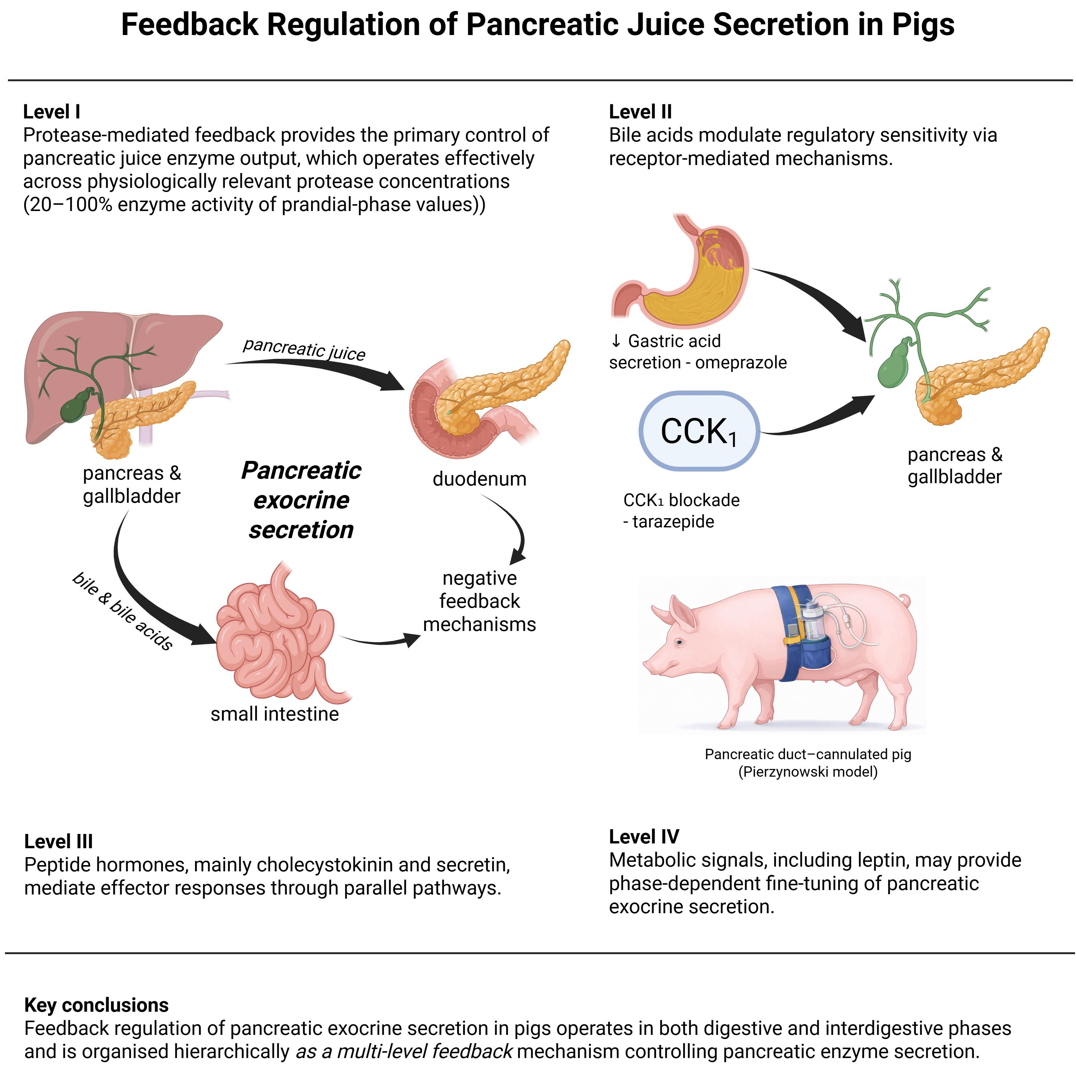 This study provides experimental evidence that pancreatic exocrine secretion in weaned piglets is regulated by multiple interacting feedback mechanisms operating along the gastrointestinal tract. Using chronic porcine models, we demonstrate that pancreatic enzyme output is shaped by the integrated action of luminal, hormonal, and bile-related signals.