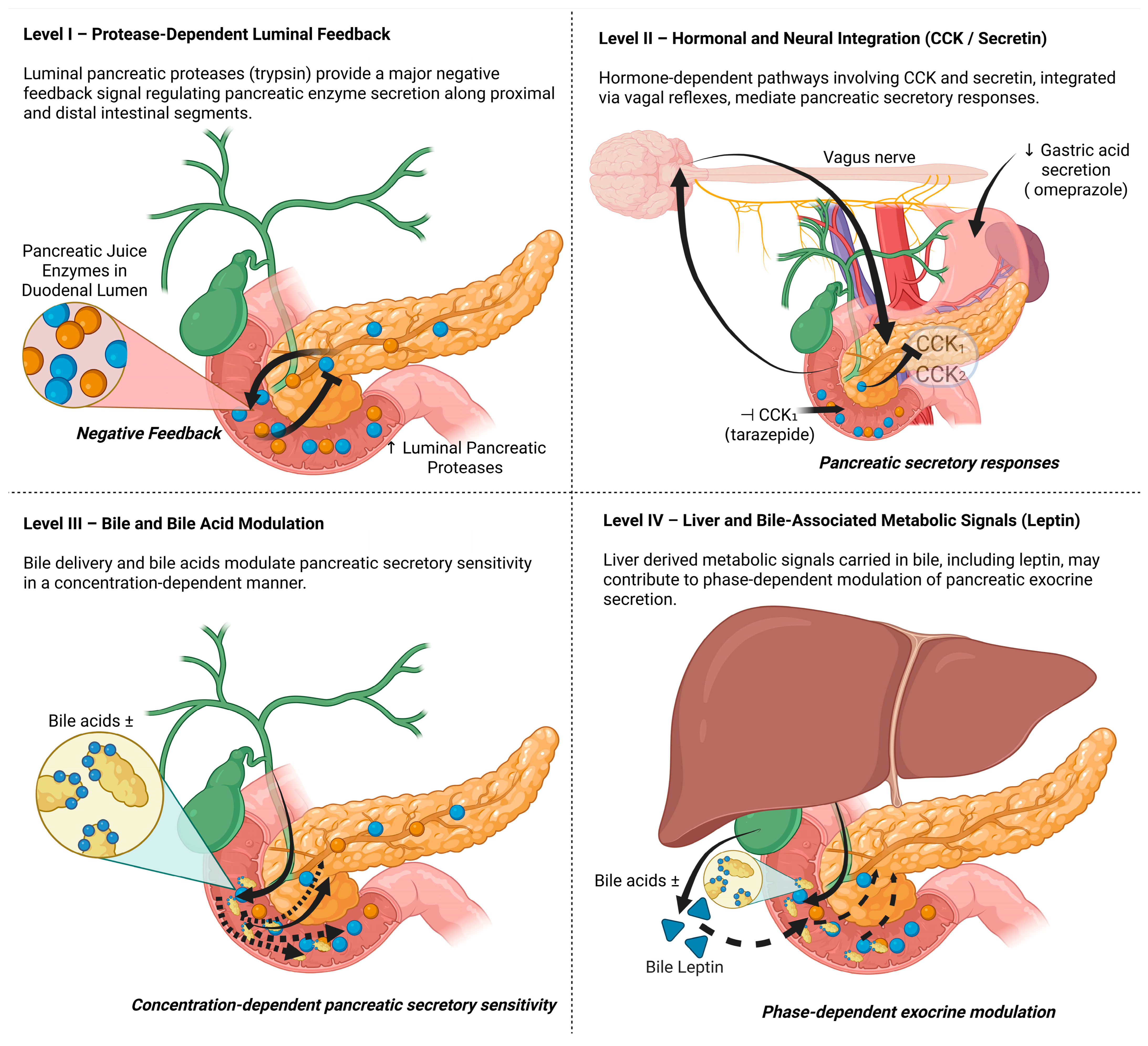 Overall, the findings support an integrative regulatory framework in which protease-dependent feedback constitutes a core control mechanism, while bile-, hormone-, and metabolism-related signals modulate the magnitude and temporal pattern of pancreatic exocrine secretion.