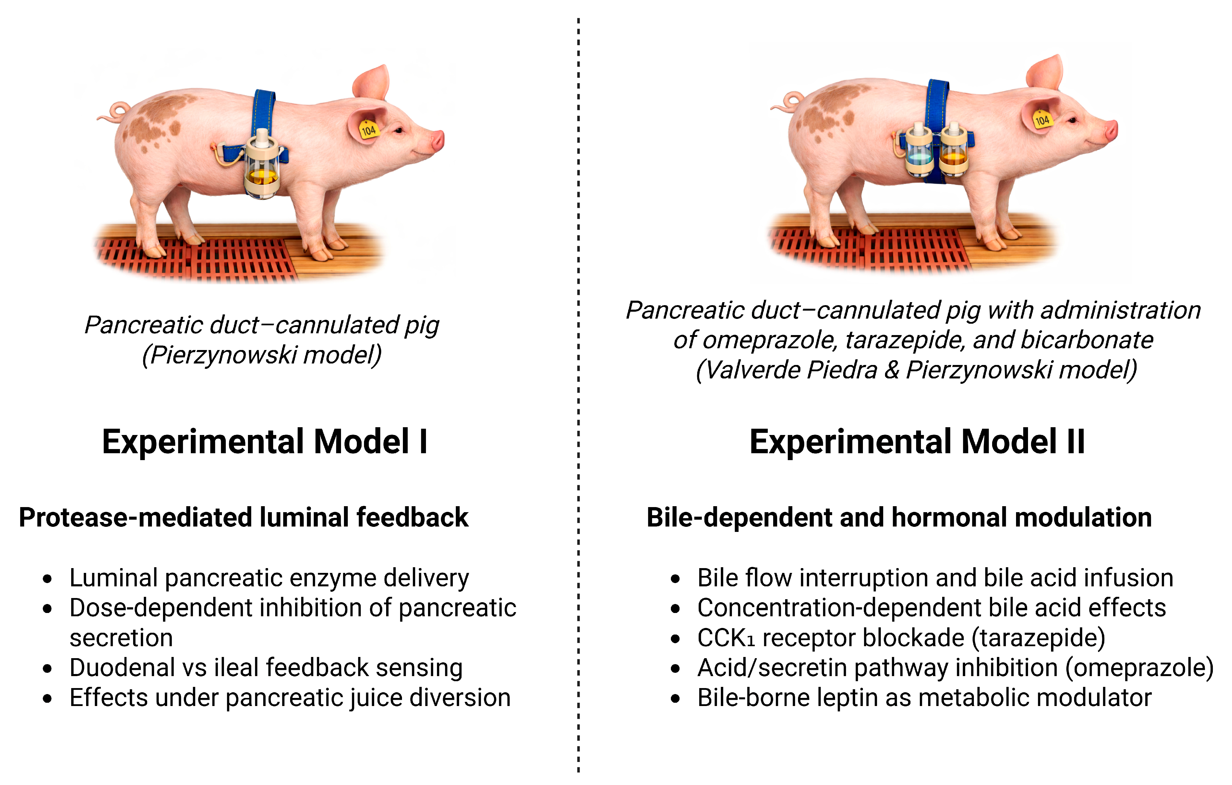 By integrating selective withdrawal and controlled reintroduction of pancreatic juice and bile with targeted pharmacological interventions, this study aimed to delineate the relative contribution and functional hierarchy of luminal enzyme feedback, bile acid signalling, hormonal pathways, and bile-associated metabolic cues in the coordinated regulation of pancreatic exocrine function.