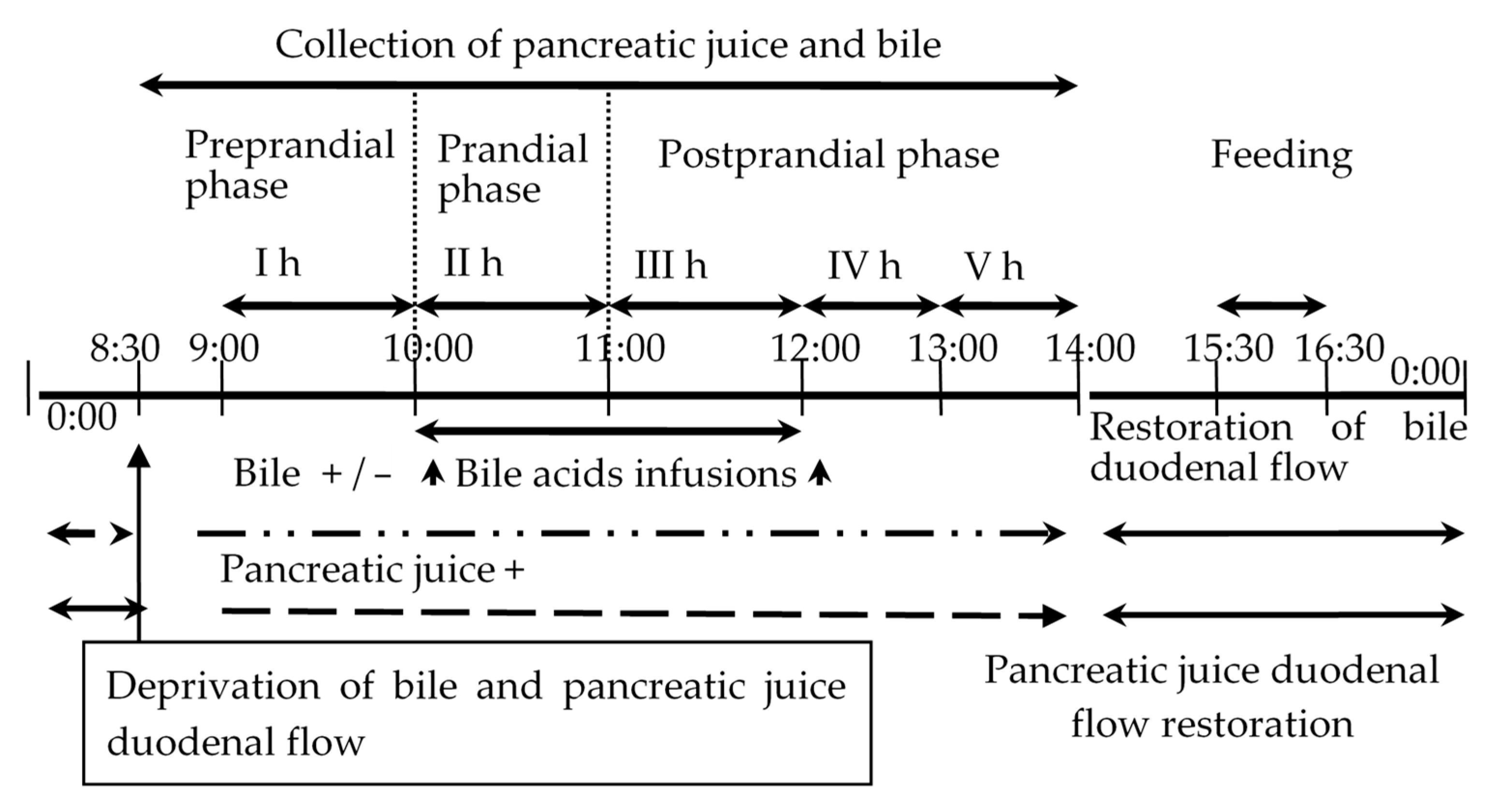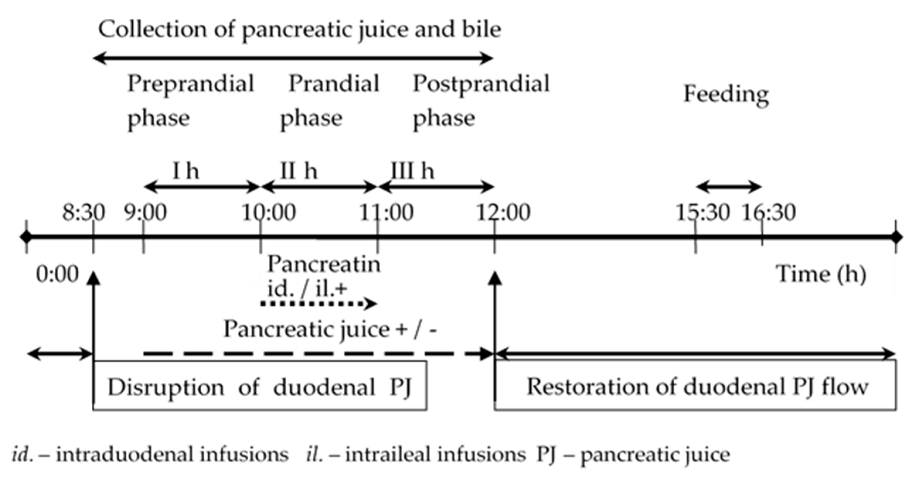 Collection of pancreatic juice and bile was performed during the morning feeding session and lasted 5 h, comprising a 1 h preprandial period, a 1 h prandial period, and a 3 h postprandial period. Secretions were collected at 30 min intervals; volumes were recorded, and 1.5 mL aliquots were stored at −20 °C for subsequent analyses. The remaining pancreatic juice and bile were either reintroduced into the duodenum during the subsequent collection interval or chilled and reintroduced after completion of the experiments.