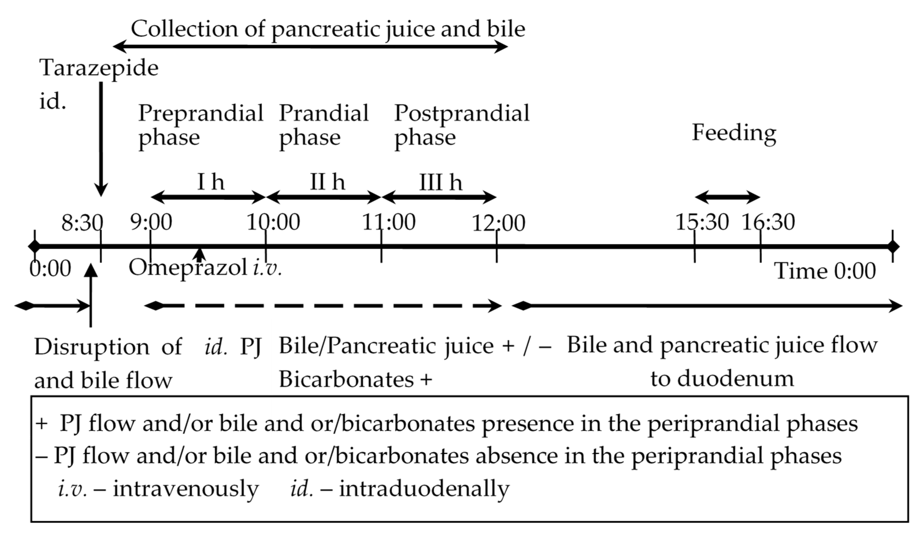 In addition, pancreatic juice secretion was assessed under conditions of eliminated bile flow combined with intraduodenal bicarbonate infusion, administered in volumes corresponding to the bile output measured in individual collection intervals (Experiment 21). The doses of omeprazole and tarazepide were selected based on previously published studies [