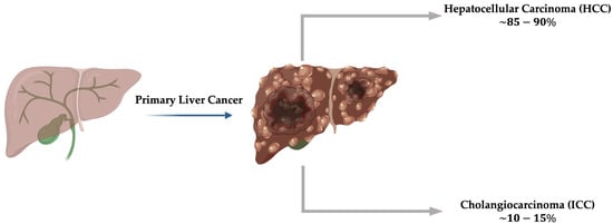 Primary liver cancers, including HCC (85–90%) and ICC (10–15%), arising from the malignant transformation of hepatocytes and cholangiocytes. This image was created using the BioRender online tool (www.biorender.com, accessed on 10 November 2025).