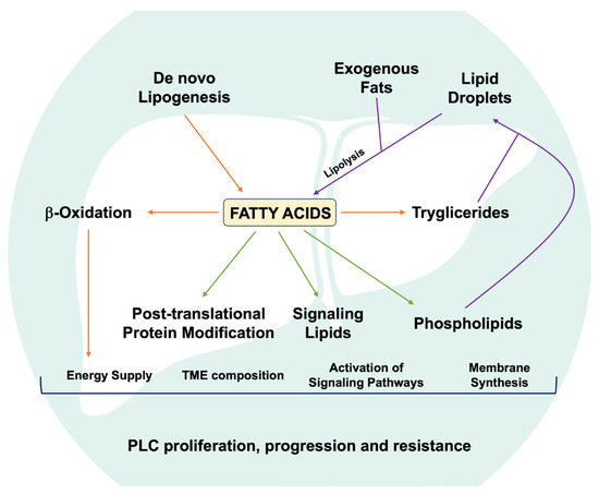 Alterations in fatty acid metabolism can promote diverse aspects of PLC development, affecting ability to proliferate, tumor progression and response to treatment. PLC, primary liver cancer; TME, tumor microenvironment. This image was modified from Wang M et al. doi: 10.2217/hep-2016-0012.