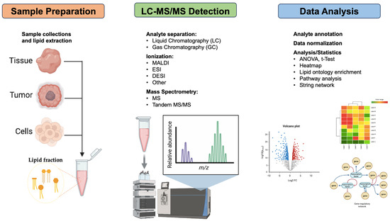 Schematic lipidomic workflow for primary liver cancer research. Three main steps to lipidomic analysis including sample preparation, MS detection, and data analysis. Abbreviations: ESI, electrospray ionization; MALDI, matrix-assisted laser desorption ionization; DESI, desorption electrospray ionization; MS, mass spectrometry; ANOVA, analysis of variance. This image was modified using the BioRender online tool (www.biorender.com, accessed on 10 November 2025).