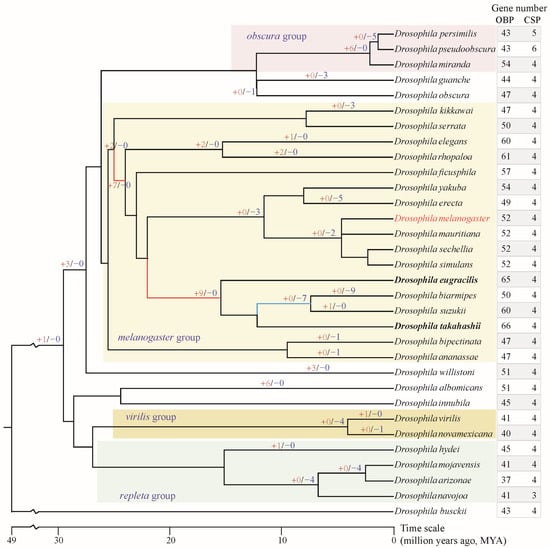 Gene number of OBP and CSP families in genus Drosophila and gene gain/loss of OBPs. The species tree was obtained from the TimeTree database (http://www.timetree.org/ (accessed on 1 October 2025)). The “+red number” on the branch indicates the number of OBP genes gained, while the “−blue number” indicates the number of OBP genes lost. Unlabeled branches indicate no gene gain or loss occurred. The red branches in the melanogaster group indicate greater expansion of the OBP gene; the blue branch indicated greater loss of the OBP gene. The bold species indicate the highest total number of OBP genes.