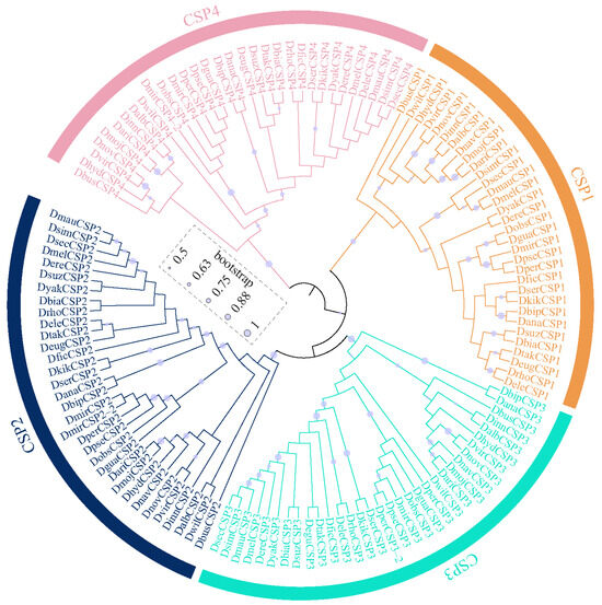 The maximum-likelihood phylogenetic tree of the CSP family in 32 Drosophila species.