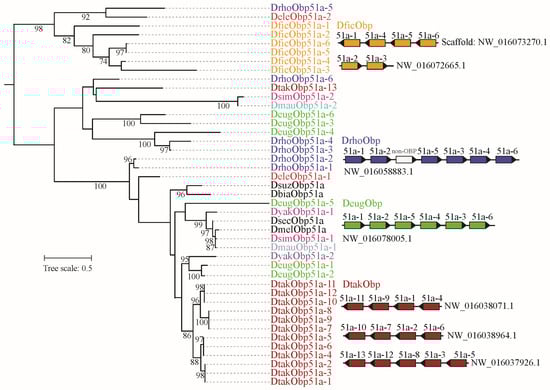 Phylogeny and chromosome distribution of orthologous gene group of Obp51. The ML tree was reconstructed by IQ-TRee v.1.6.12. The bootstrap values (>70%) were displayed. The Obp51 was expanded in D. ficusphila, D. rhopaloa, D. eugracilis, and D. takahashii. The distribution of duplicated genes on the scaffold was presented. The non-OBP gene within the DrhoObp51 gene cluster encodes other protein, namely non-OBP gene.