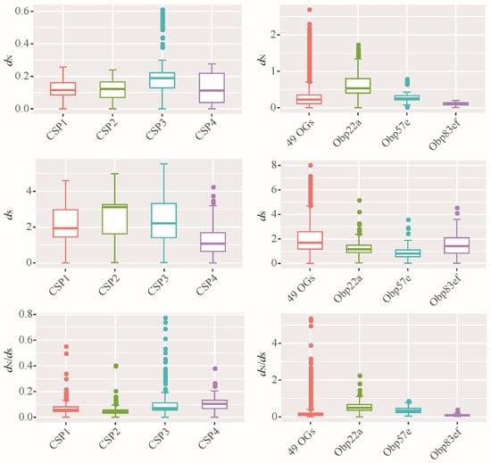 Evolutionary rates of orthologous groups of CSP and OBP families. dN: non-synonymous substitution rate; dS: synonymous substitution rate; the dN/dS also known as ω value. Based on the ML phylogenetic tree, all the Drosophila CSPs were classified 4 OGs, including CSP1, CSP2, CSP3, and CSP4. Accordingly, all the OBP members were classified 52 OGs. For the OBP family, the evolutionary rates of 49 OGs were plotted together, namely 49 OGs. Additionally, three OGs each performed plotting, including Obp22a, Obp57e and Obp83ef.