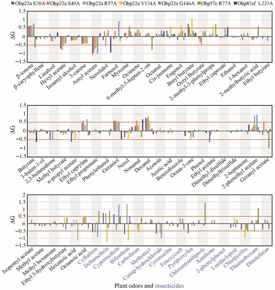 To investigate the impact of positive selection on odorant-binding function, this study employed homology modeling and molecular docking to simulate the differentiation of ligand-binding affinity among Drosophila species. DmelOBP22a, DmelOBP57e, and DmelOBP83ef proteins from D. melanogaster were used as template sequences to investigate the functional impact of sites under positive selection. The homology models were generated and evaluated using SAVES v6. Ramachandran plots revealed that the proportion of favorable regions in all three OBP models was 92.9% or higher (Figures S2–S4). CAS is commonly used to assess the degree of functional impact at specific amino acid sites [45]. Thus, we replaced all positively selected sites of DmelOBP22a, DmelOBP57e and DmelOBP83ef with alanine to analyze changes in free binding energy (ΔG). The analysis revealed that all of the examined sites exhibited an absolute ΔG value greater than 0.5 for at least one plant-derived odor or insecticide (Table S4, Figure 6). This suggests that the positively selected sites may play a significant role in the binding to specific ligands [44,45].
