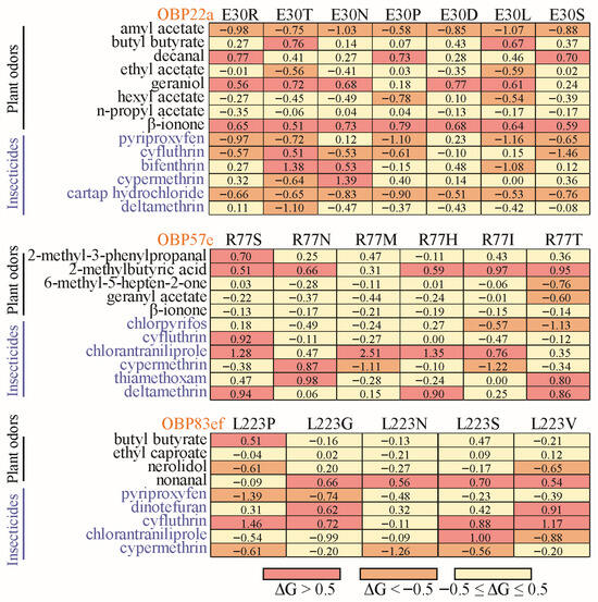 Under the influence of natural selection, positively selected sites often exhibit amino acid divergence among different species (Figures S5–S7). To gain deeper insight into the functional diversification, the positive selection sites were used for site-directed mutagenesis with corresponding amino acids from other Drosophila species (Table S5). For example, the glutamine (E) residue at position 30 of DmelOBP22a was replaced with one of seven variants (R, T, P D, L, S, and N) in other Drosophila species (Figure S5). Docking results showed that when E30 of DmelOBP22a was mutated to R, T, N, P, D, L, and S, the free binding energies to amyl acetate and cartap hydrochloride decreased, while the free binding energy to β-ionone increased (Table S5 and Figure 7). In addition to plant odor molecules, we also observed that variations at positively selected sites significantly influenced the binding capacity for certain insecticides (Table S5, Figure 7). Similarly, the positively selected sites in OBP57e and OBP83ef exhibited functional differentiation in response to certain plant odors and insecticides (Figure 7).