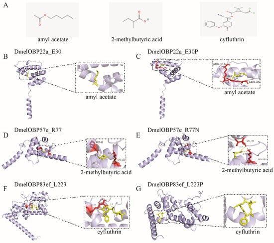 Docking of ligands into the binding pocket of the three OBPs undergoing positive selection and the interaction patterns. (A) Structure of the ligands. The amyl acetate and 2-methylbutyric acid are plant odors; cyfluthrin is insecticide. (B) Docking of amyl acetate into the binding pocket of DmelOBP22a. The site 30 of DmelOBP22a is Glutamate (E) (Figure S5). (C) Docking of amyl acetate into the binding pocket of DmelOBP22a after the position E30 is mutated to Proline. (D) Docking of 2-methylbutyric acid into the binding pocket of DmelOBP57e. (E) Docking of 2-methylbutyric acid into the binding pocket of DmelOBP57e after the position 77 (Arginine, R) is mutated to Asparagine (N) (Figure S6). (F) Docking of cyfluthrin into the binding pocket of DmelOBP83ef. (G) Docking of cyfluthrin into the binding pocket of DmelOBP83ef after the position 223 (Leucine, L) is mutated to Proline (P) (Figure S7).