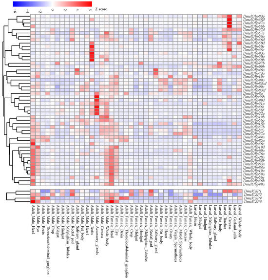 Temporal-spatial expression profiles of OBP and CSP genes in D. melanogaster. The expression signals (FPKM values) of all the OBP and CSP genes were downloaded from Flyatlas2 (https://motif.mvls.gla.ac.uk/FlyAtlas2/ (accessed on 5 November 2025)).