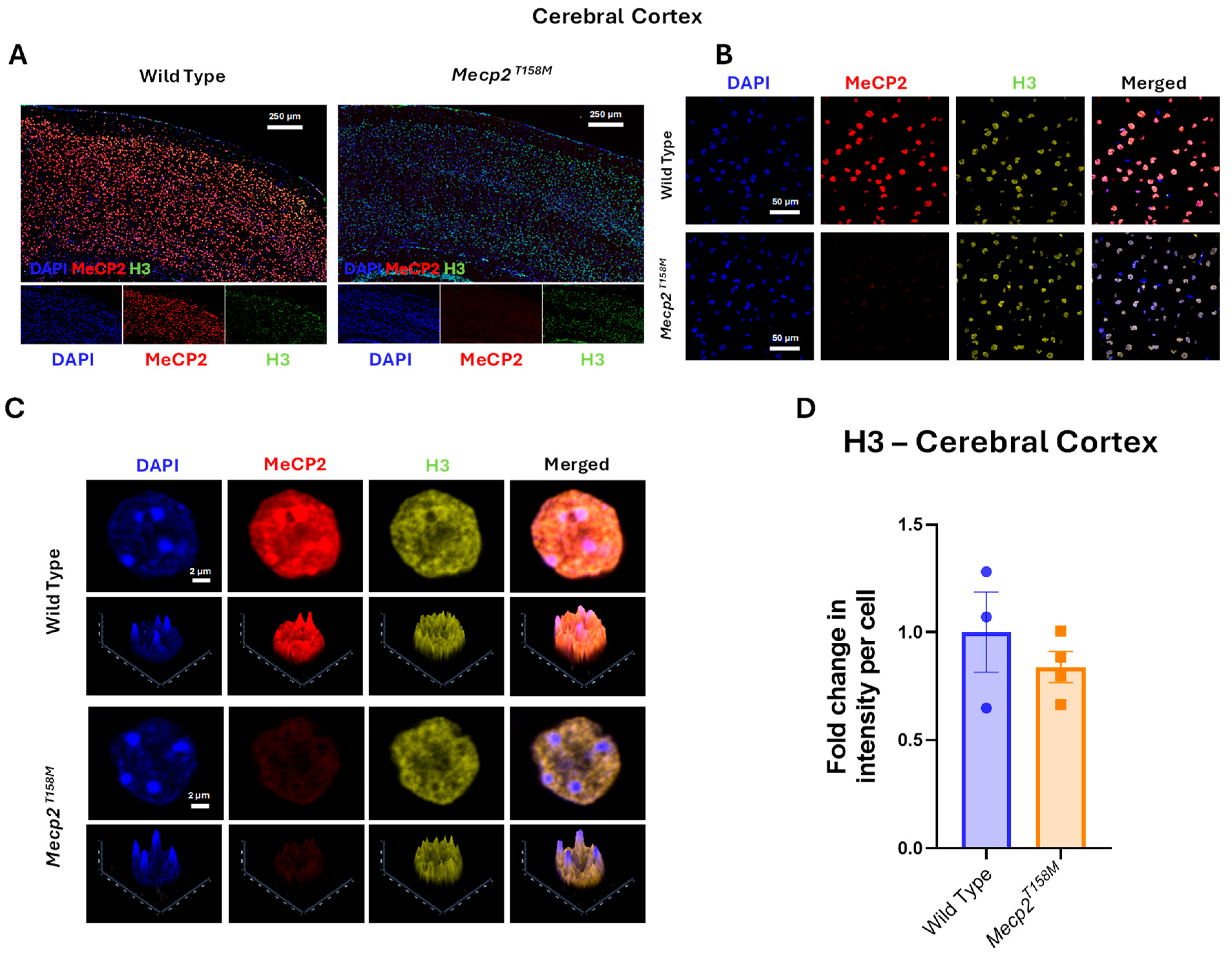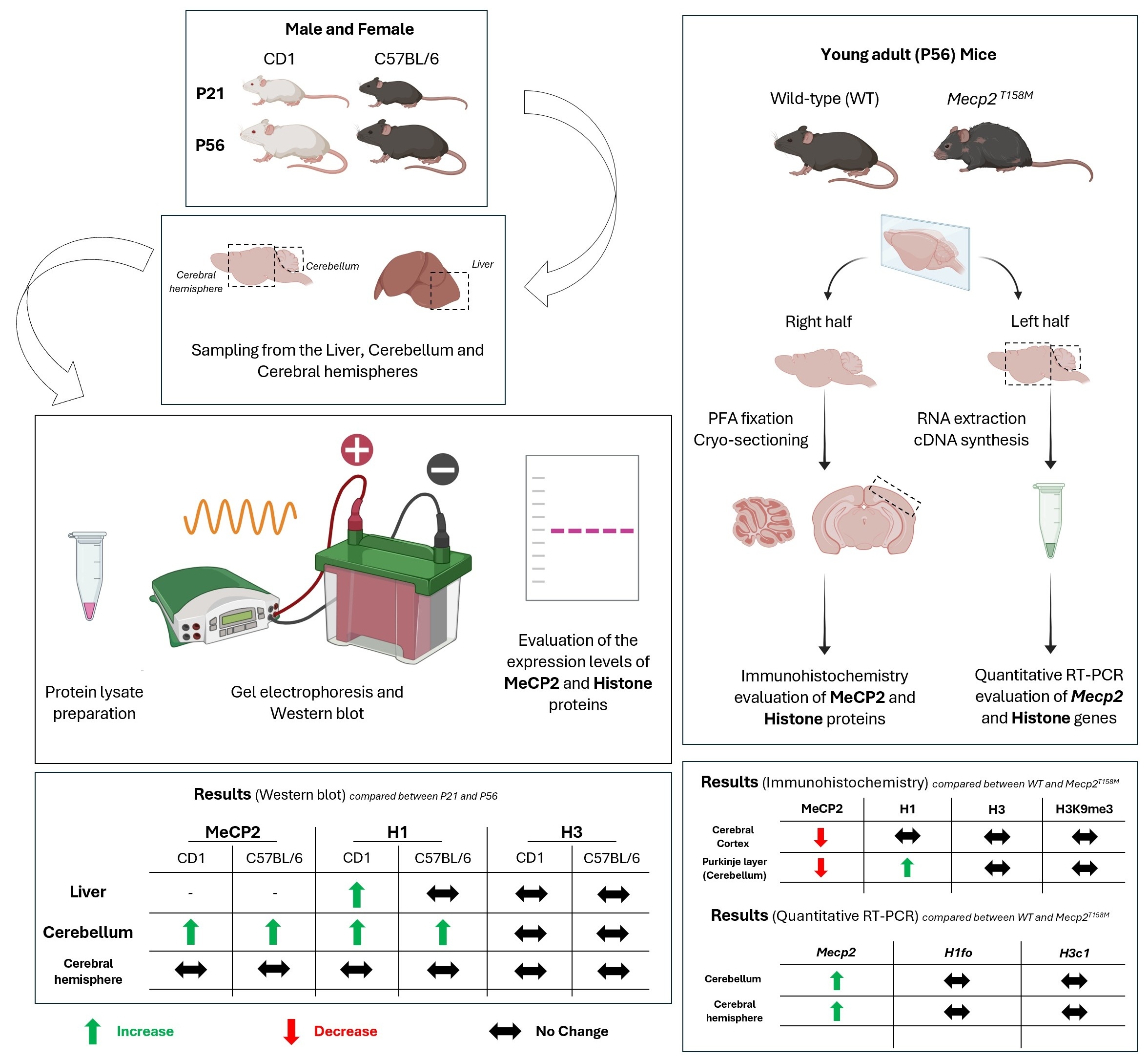 To address these questions, we first aimed to study the impact of genetic background on the expression of core histone and chromatin proteins in two specific brain regions during adolescent development by Western blot (CD1 mice and C57BL/6). We studied two specific brain regions (namely, the cerebellum and the cerebral hemisphere) at P21 and P56 and investigated the expression of H1, H3, and MeCP2 proteins. Next, we studied the effect of the T158M MeCP2 mutation (change of threonine to methionine) on the potential interplay between MeCP2 and histone proteins by immunohistochemistry (IHC) and possible effect on their transcript levels by real-time Reverse-Transcriptase Polymerase Chain Reaction (RT-PCR). Our results help to establish a framework for interpreting the role of chromatin composition in postnatal brain, providing insight into the biology of the brain.