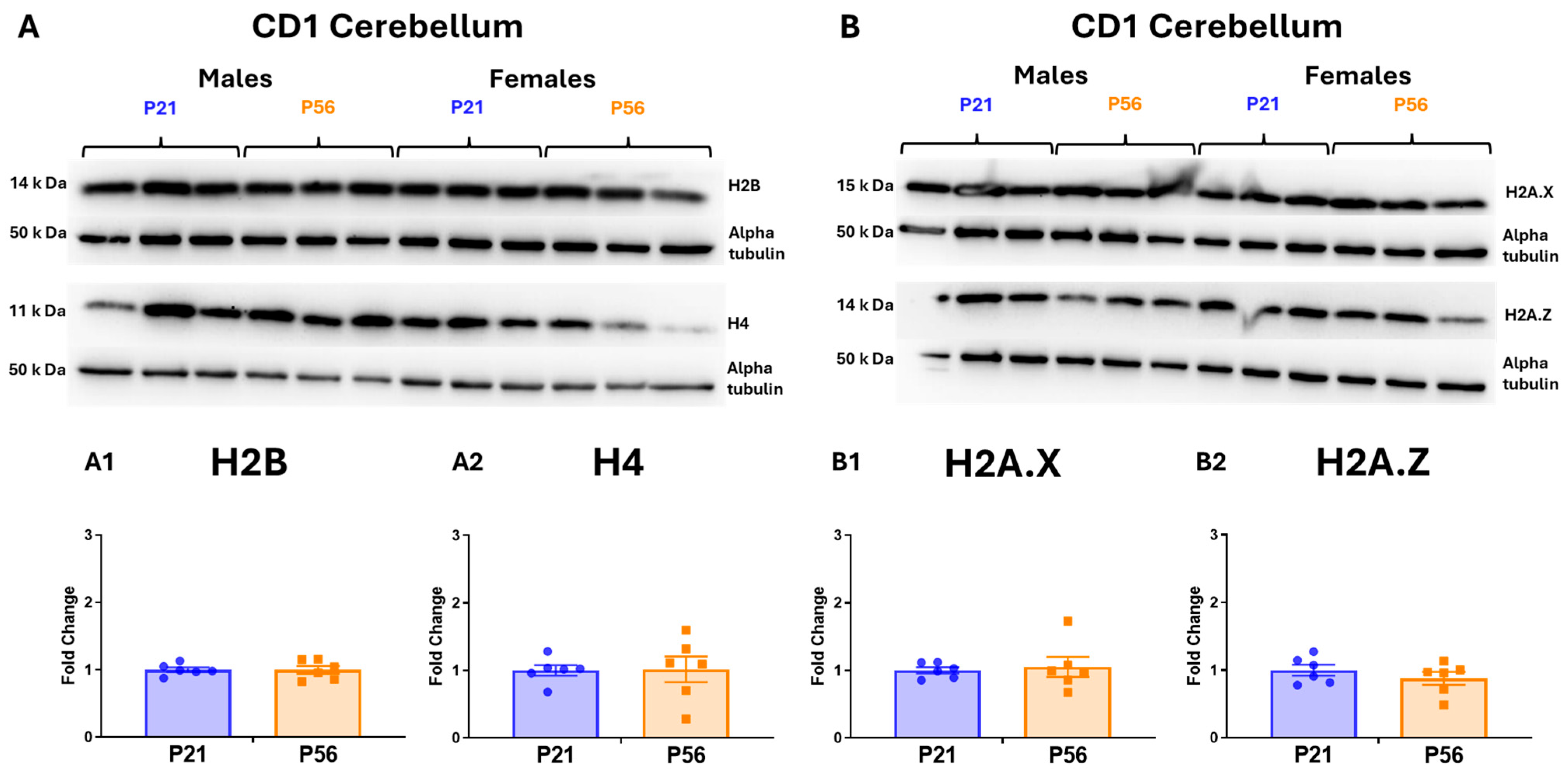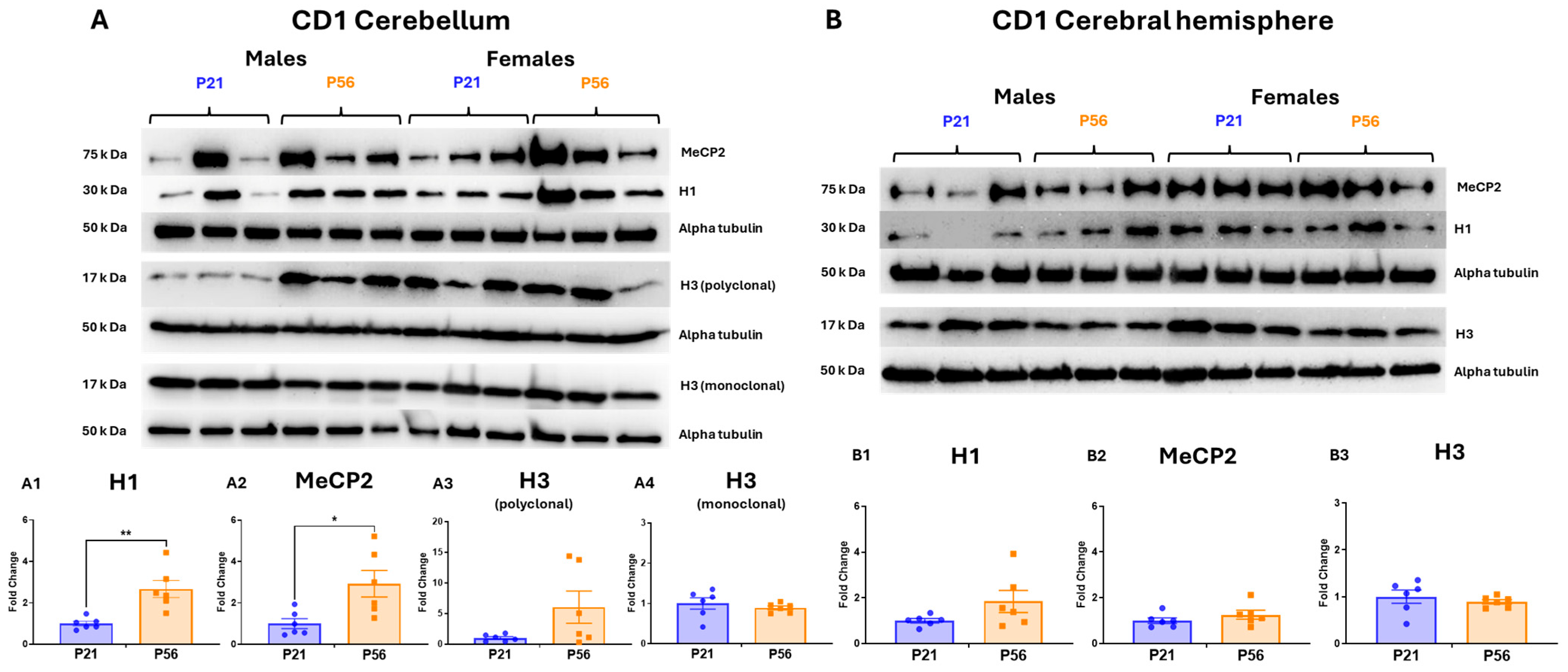 Our findings did not show any significant impact on H3 protein levels in either strain between P21 and P56. We observed an increasing trend in H3 levels in the cerebellum of CD1 mice using a polyclonal H3 antibody; however, this trend did not reach statistical significance. But this was not observed when we used a monoclonal H3 antibody. Different H3 antibodies frequently show differing sensitivity to H3 variants, epitopes, and PTMs, even though core histones, especially H3, are highly conserved and identical or nearly identical across their canonical sequences [