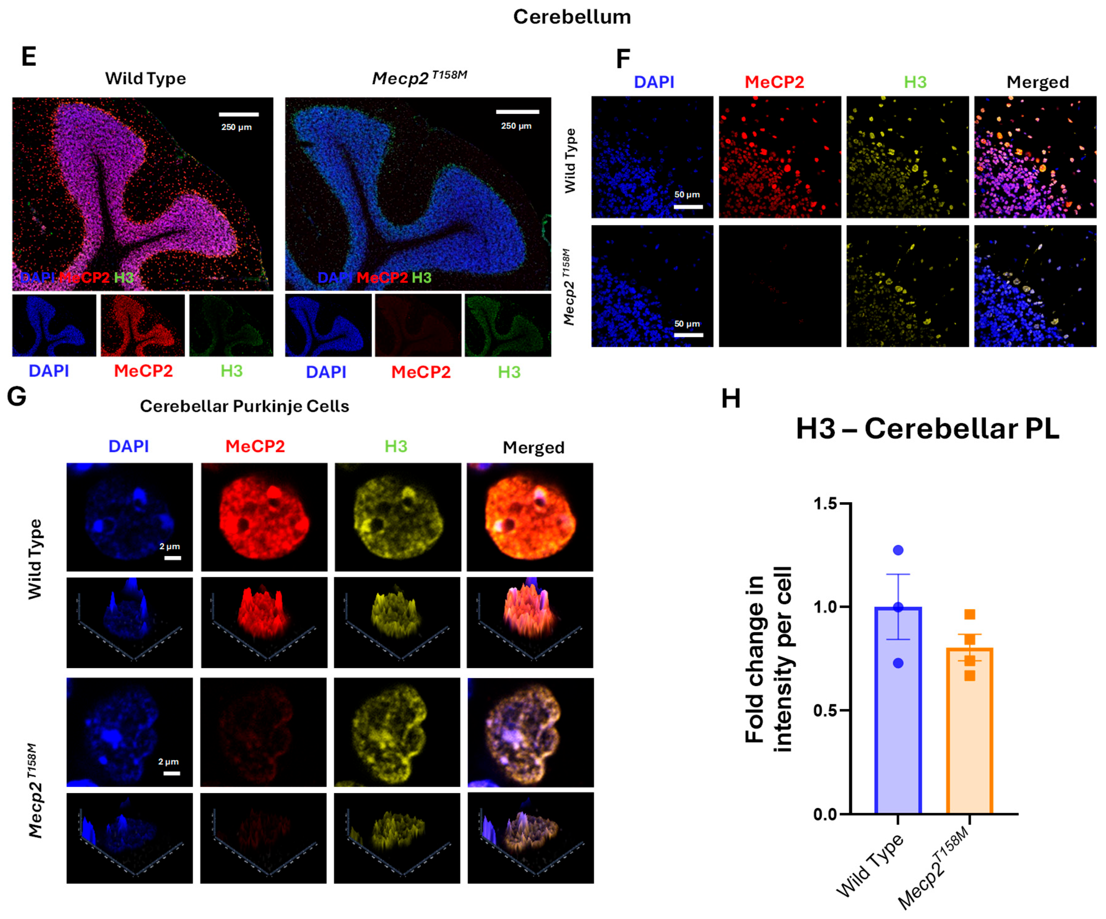 33]. We observed that H1 protein levels are significantly increased in the Purkinje layer of the cerebellum in mutant mice compared to WT mice, associated with a significant decrease in the MeCP2 protein levels, which we previously reported [