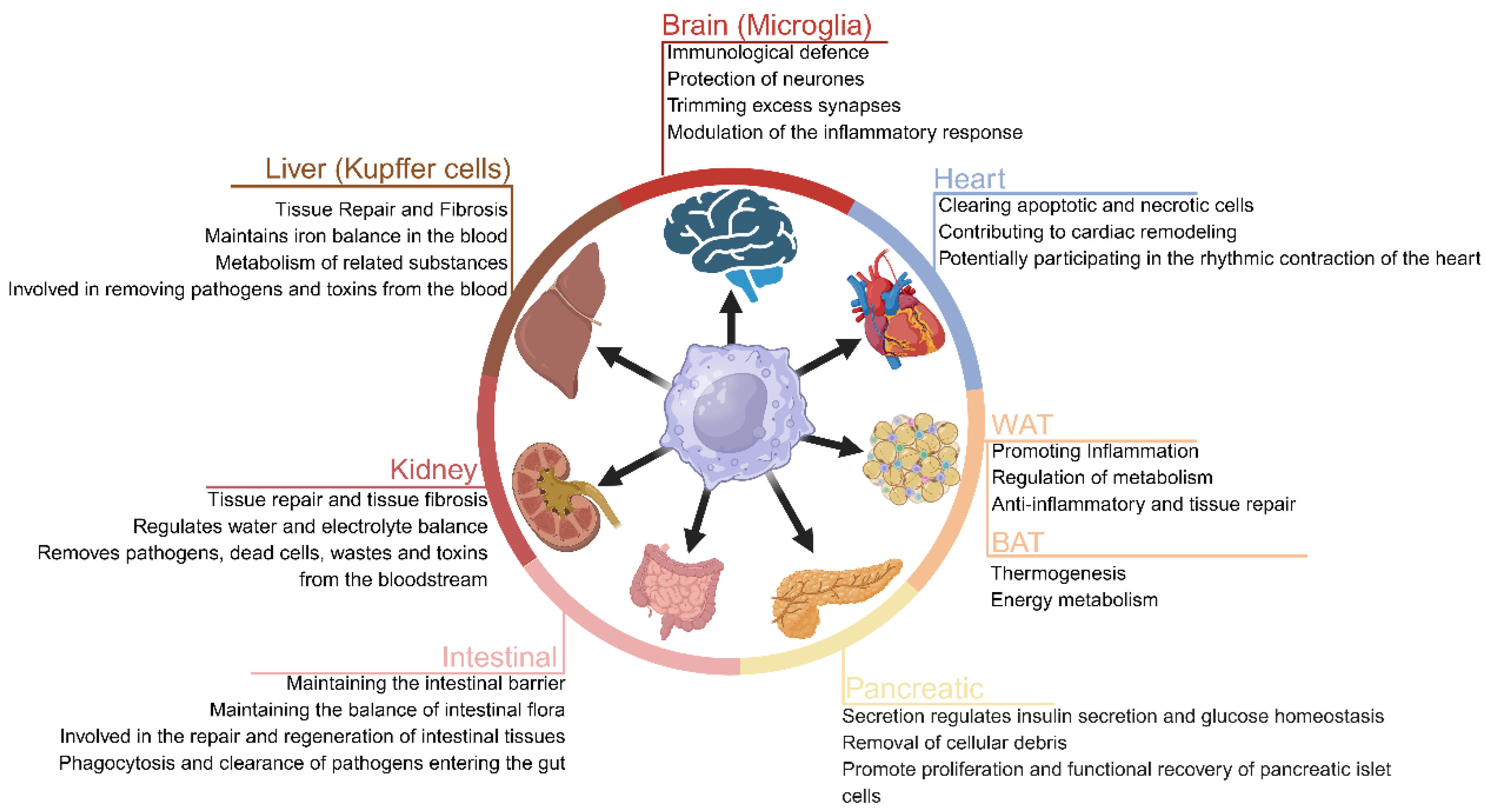 - Lazarov, T.; Juarez-Carreño, S.; Cox, N.; Geissmann, F. Physiology and diseases of tissue-resident macrophages. Nature 2023, 618, 698–707. [Google Scholar] [CrossRef]