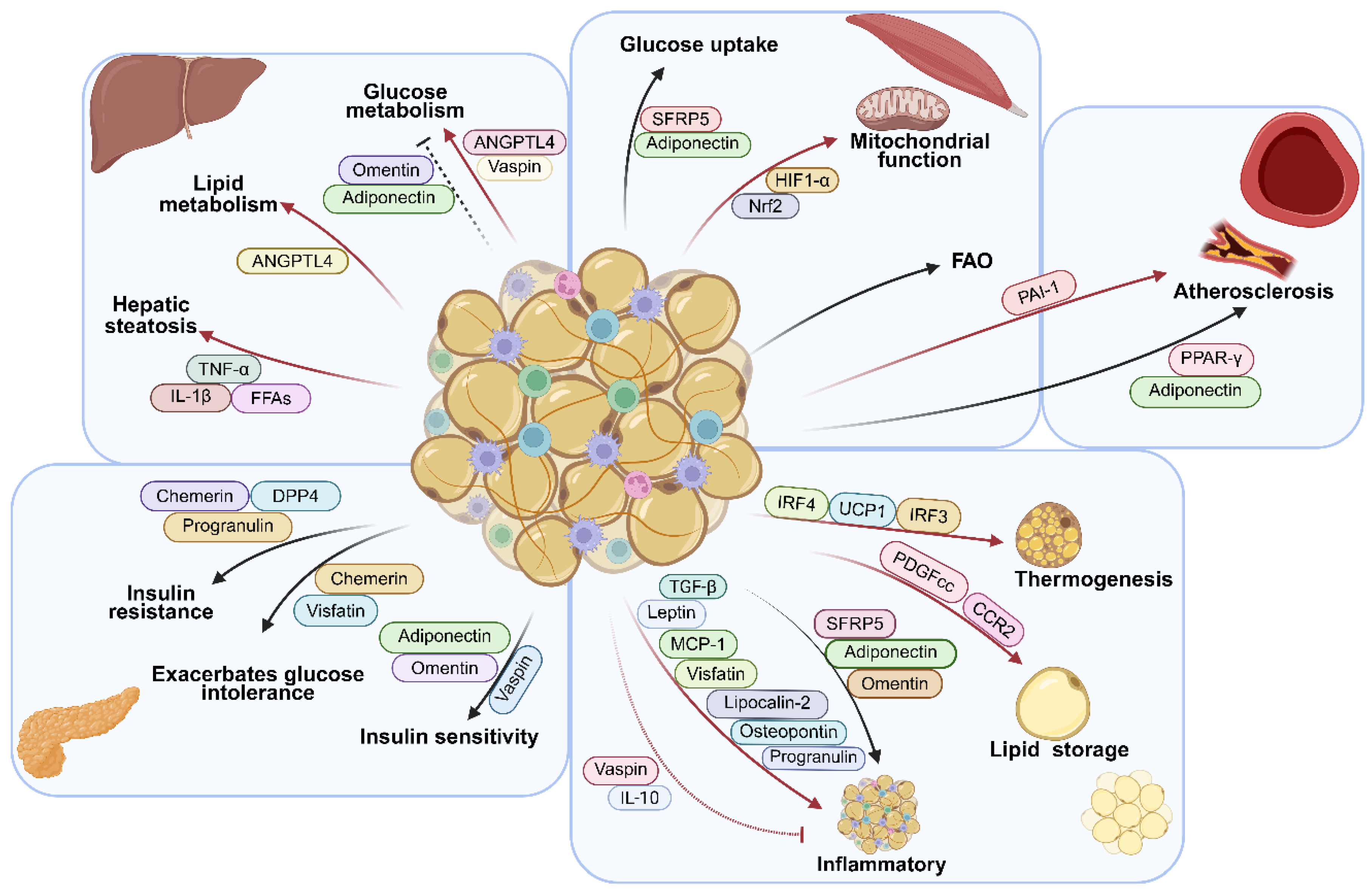 ![]() | Metabolic changes and the inflammatory environment of adipose tissue under obesity | Inflammatory cytokine (TNF-α, IL-6, Leptin, Adiponectin) | Promoting inflammatory responses and metabolic disorders | [32] |