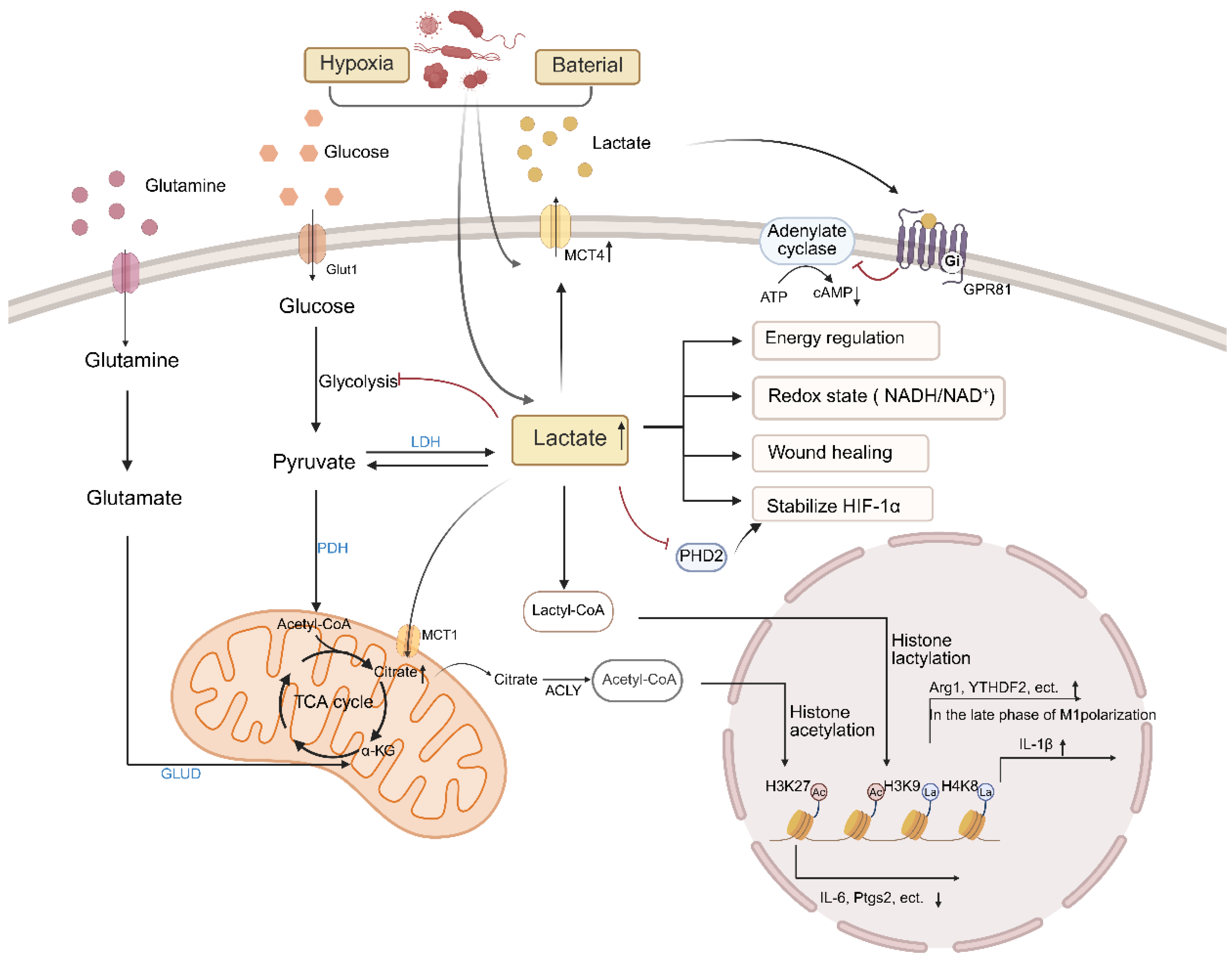 - Yang, K.; Fan, M.; Wang, X.; Xu, J.; Wang, Y.; Tu, F.; Gill, P.S.; Ha, T.; Liu, L.; Williams, D.L.; et al. Lactate promotes macrophage HMGB1 lactylation, acetylation, and exosomal release in polymicrobial sepsis. Cell Death Differ. 2022, 29, 133–146. [Google Scholar] [CrossRef]