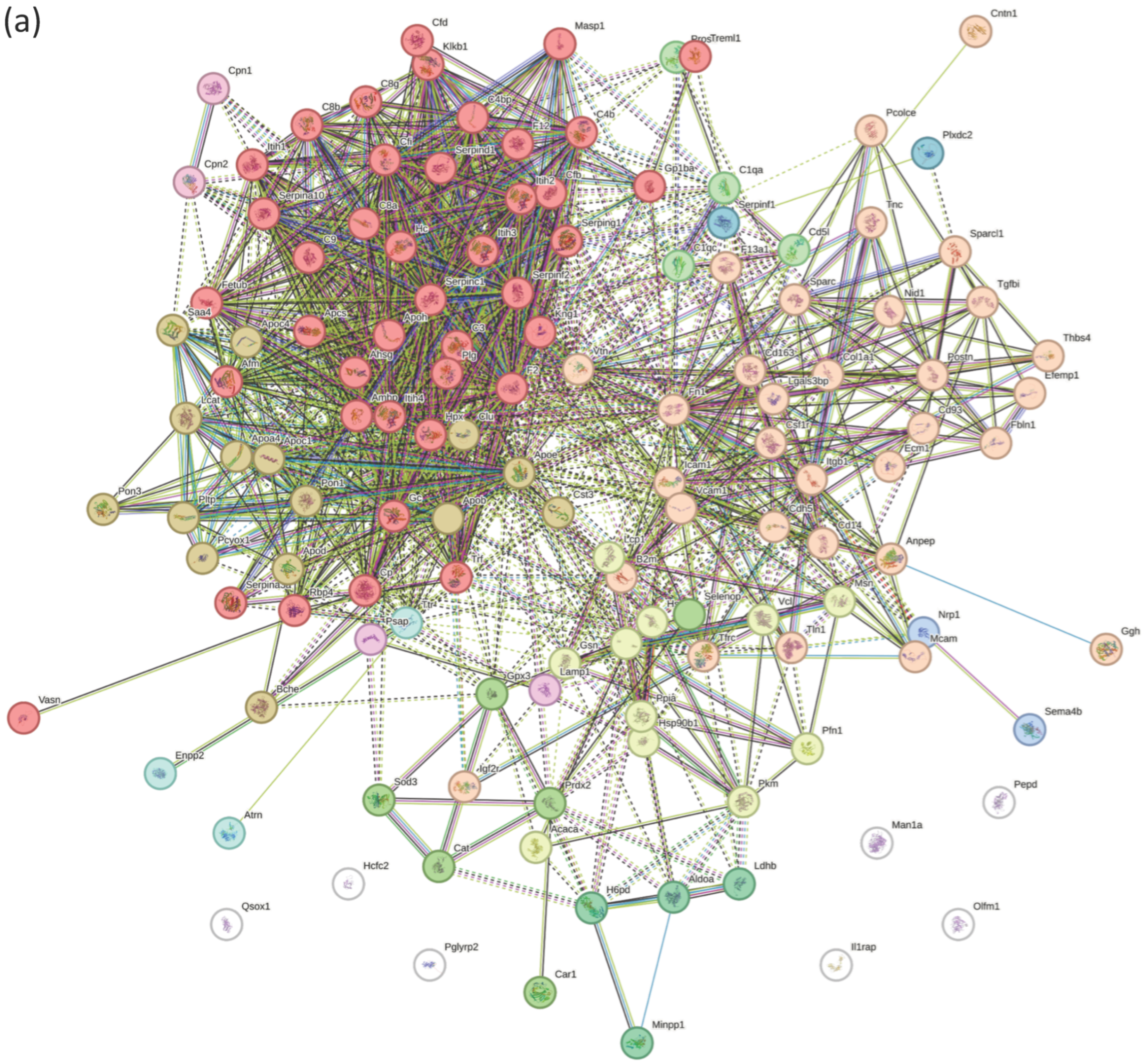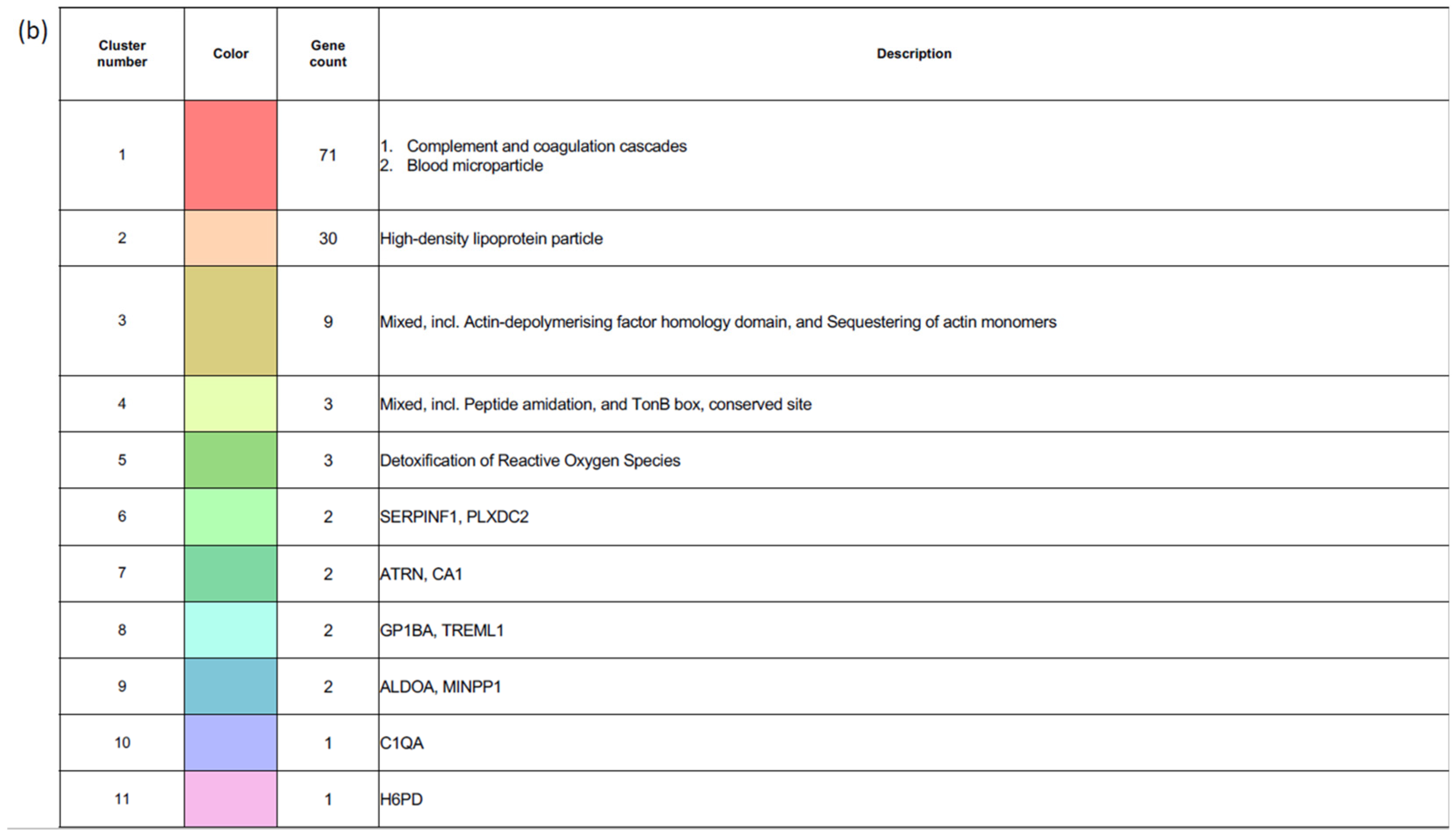 - Szklarczyk, D.; Kirsch, R.; Koutrouli, M.; Nastou, K.; Mehryary, F.; Hachilif, R.; Gable, A.L.; Fang, T.; Doncheva, N.T.; Pyysalo, S.; et al. The STRING database in 2023: Protein–protein association networks and functional enrichment analyses for any sequenced genome of interest. Nucleic Acids Res. 2023, 51, D638–D646. [Google Scholar] [CrossRef]