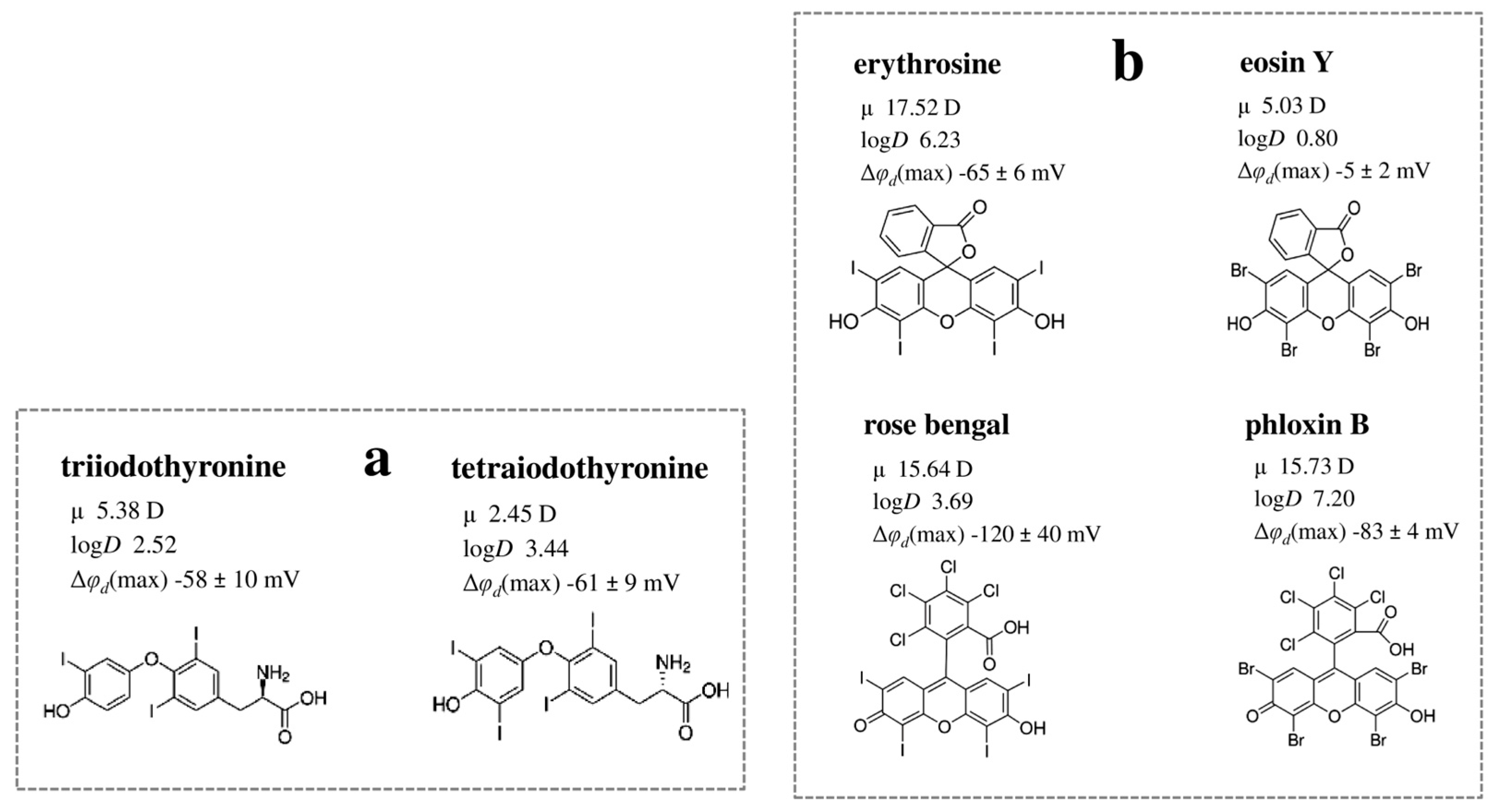 - Tsymbulskaya, M.V.; Antonenko, Y.N.; Tropsha, A.E.; Yaguzhinsky, L.S. Iodine-containing hormones—Dipole modifiers of phospholipid membranes. Biophysics 1984, 29, 801–805. [Google Scholar]