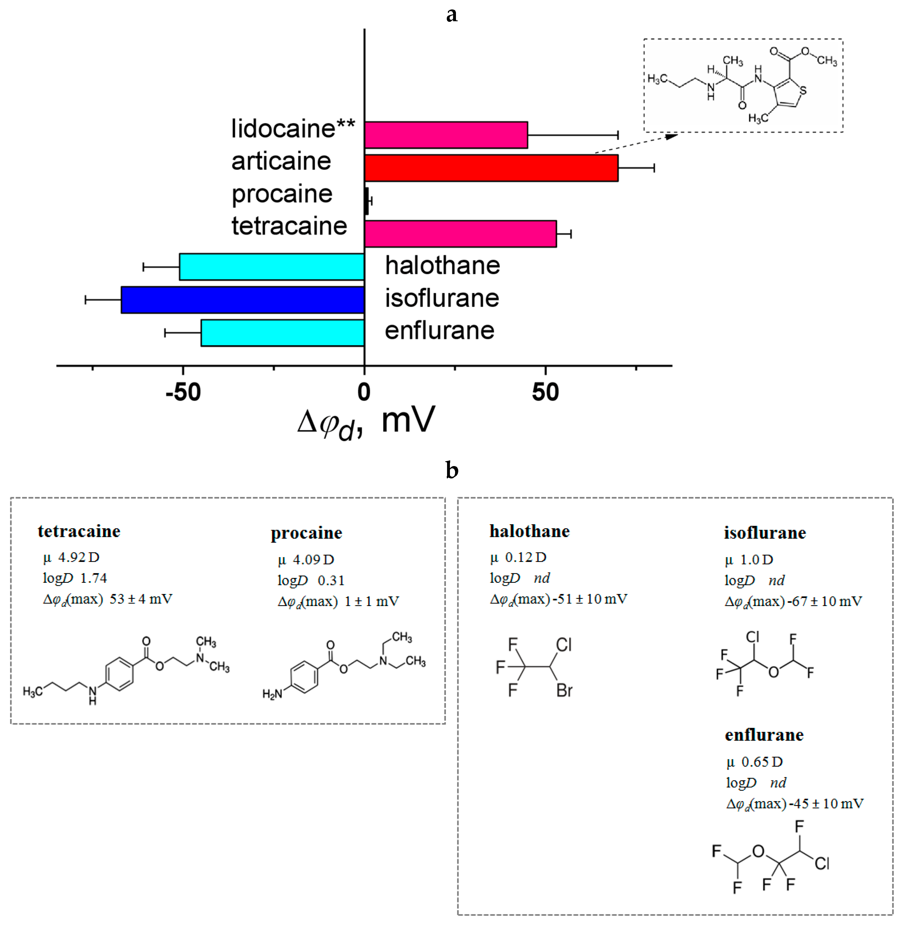 - Zapata-Morin, P.A.; Sierra-Valdez, F.J.; Ruiz-Suárez, J.C. The interaction of local anesthetics with lipid membranes. J. Mol. Graph. Model. 2014, 53, 200–205. [Google Scholar] [CrossRef] [PubMed]