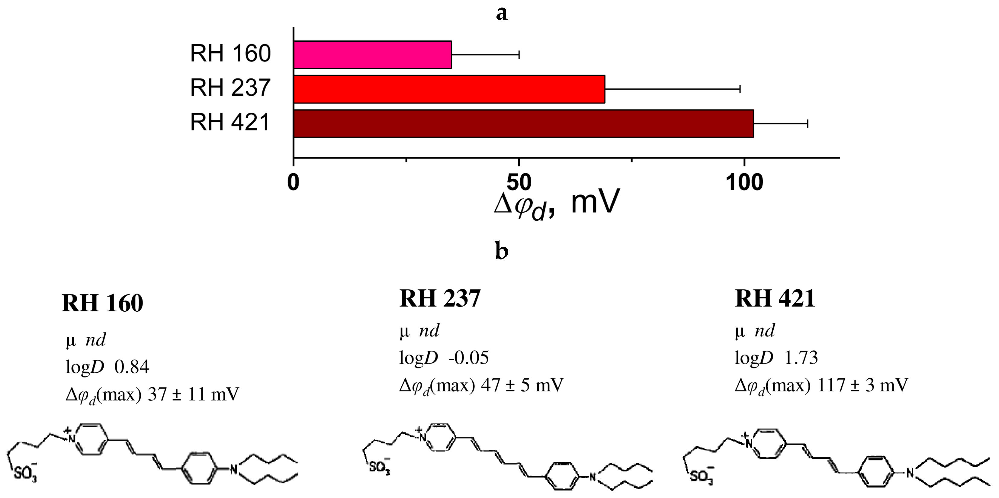 - Malkov, D.Y.; Sokolov, V.S. Fluorescent styryl dyes of the RH series affect a potential drop on the membrane/solution boundary. Biochim. Biophys. Acta 1996, 1278, 197–204. [Google Scholar]