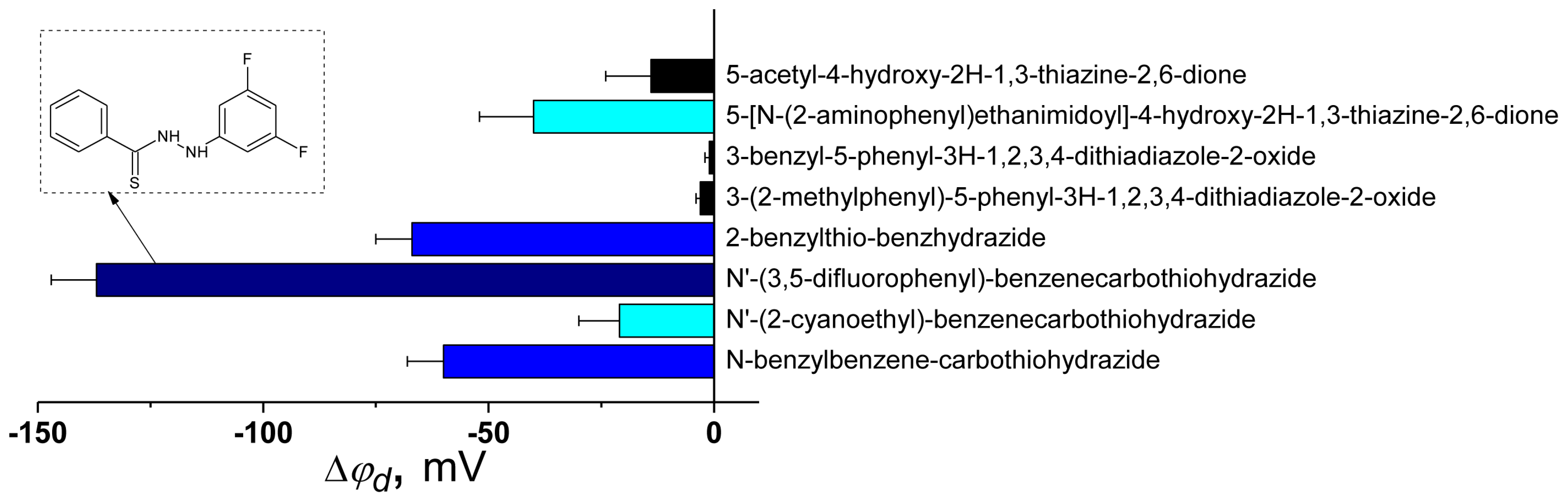 - Zakharova, A.A.; Efimova, S.S.; Yuskovets, V.N.; Yakovlev, I.P.; Sarkisyan, Z.M.; Ostroumova, O.S. 1,3-Thiazine, 1,2,3,4-Dithiadiazole, and Thiohydrazide Derivatives Affect Lipid Bilayer Properties and Ion-Permeable Pores Induced by Antifungals. Front. Cell Dev. Biol. 2020, 8, 535. [Google Scholar] [CrossRef]