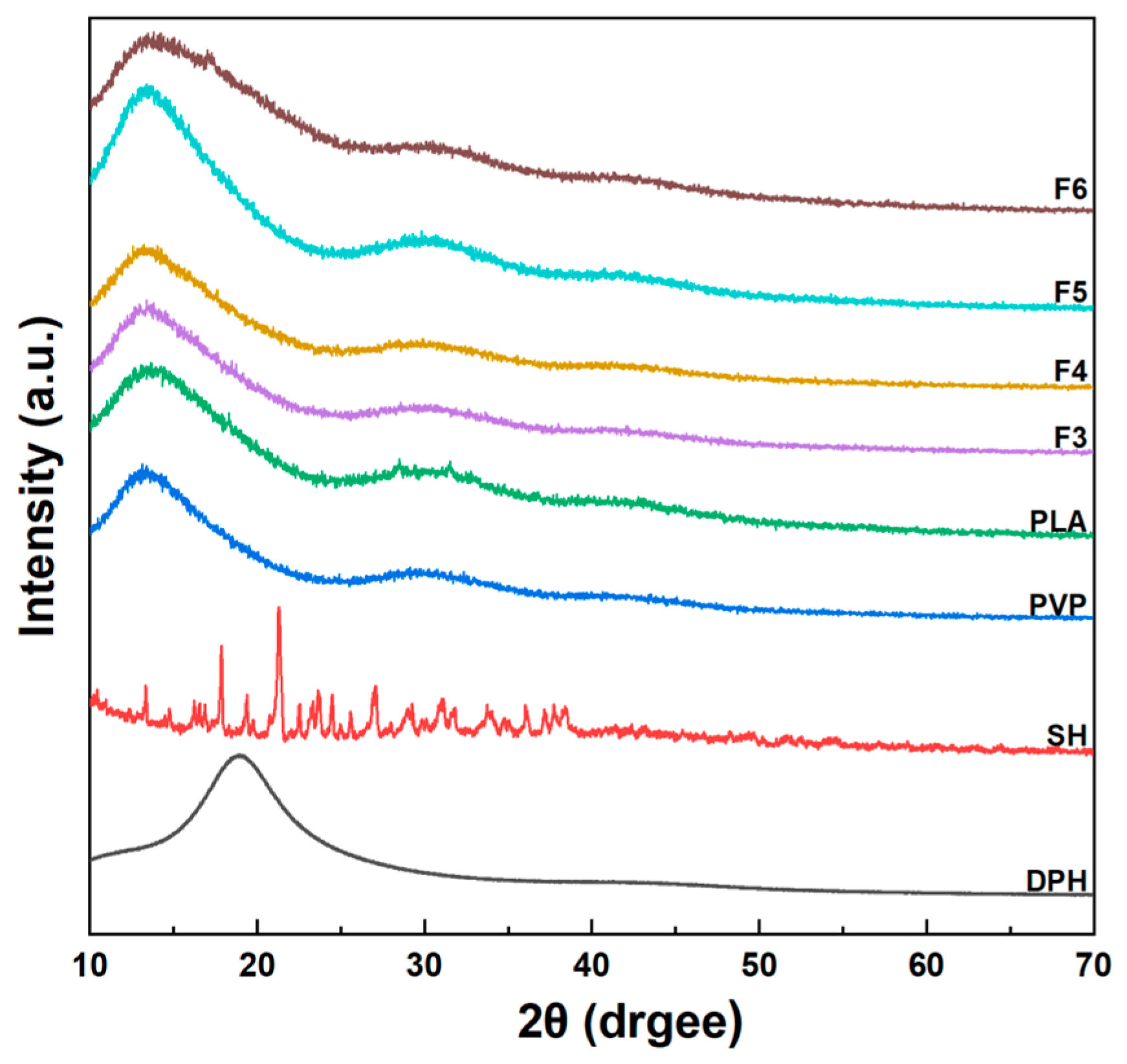 | F6 | PVP K90 | DPH | PLA | SH | 1.0/1.0 | Nanofiber | |||