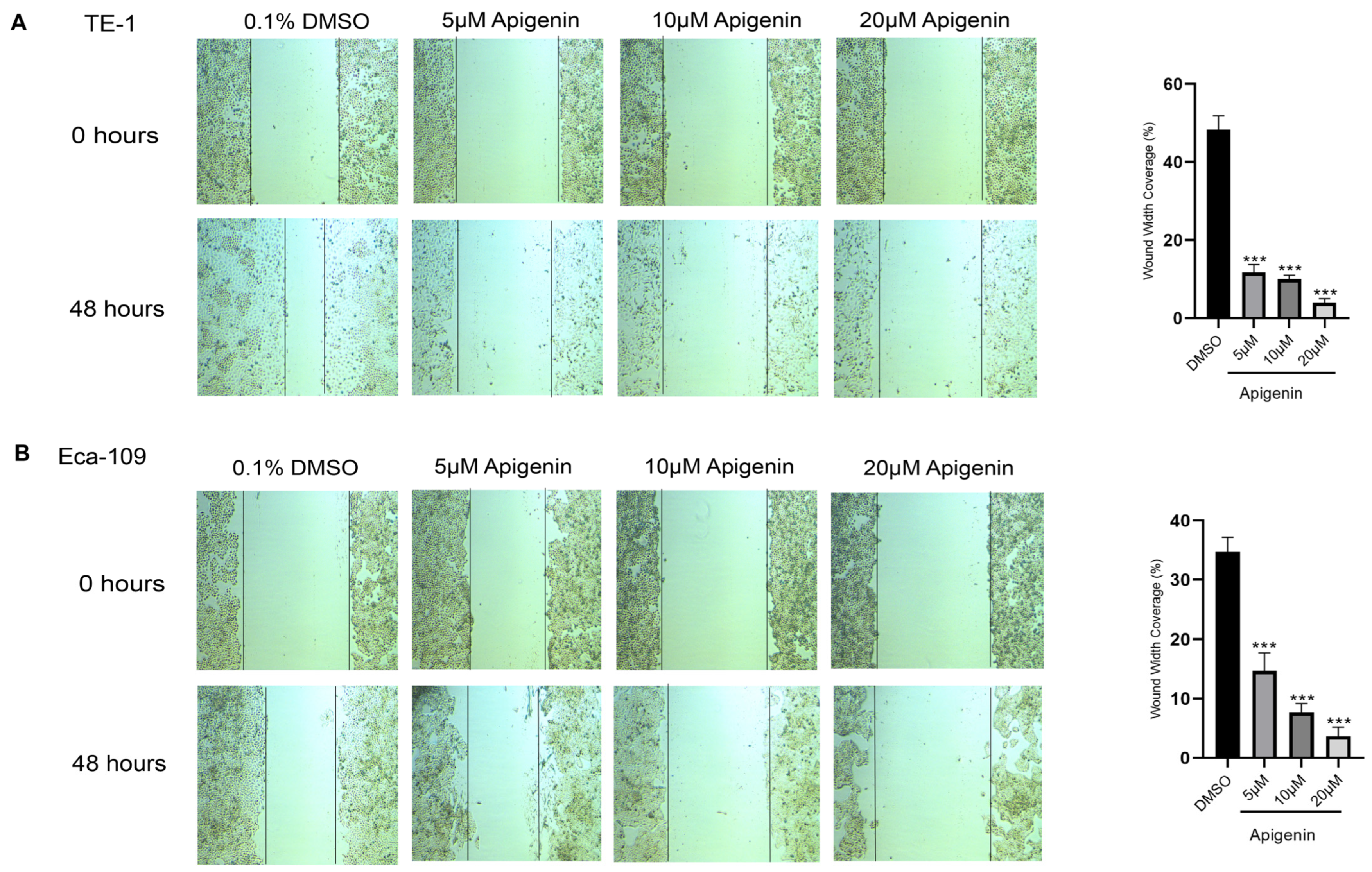 3.2. Apigenin Attenuated Wound Healing in TE-1 and Eca-109 Cells