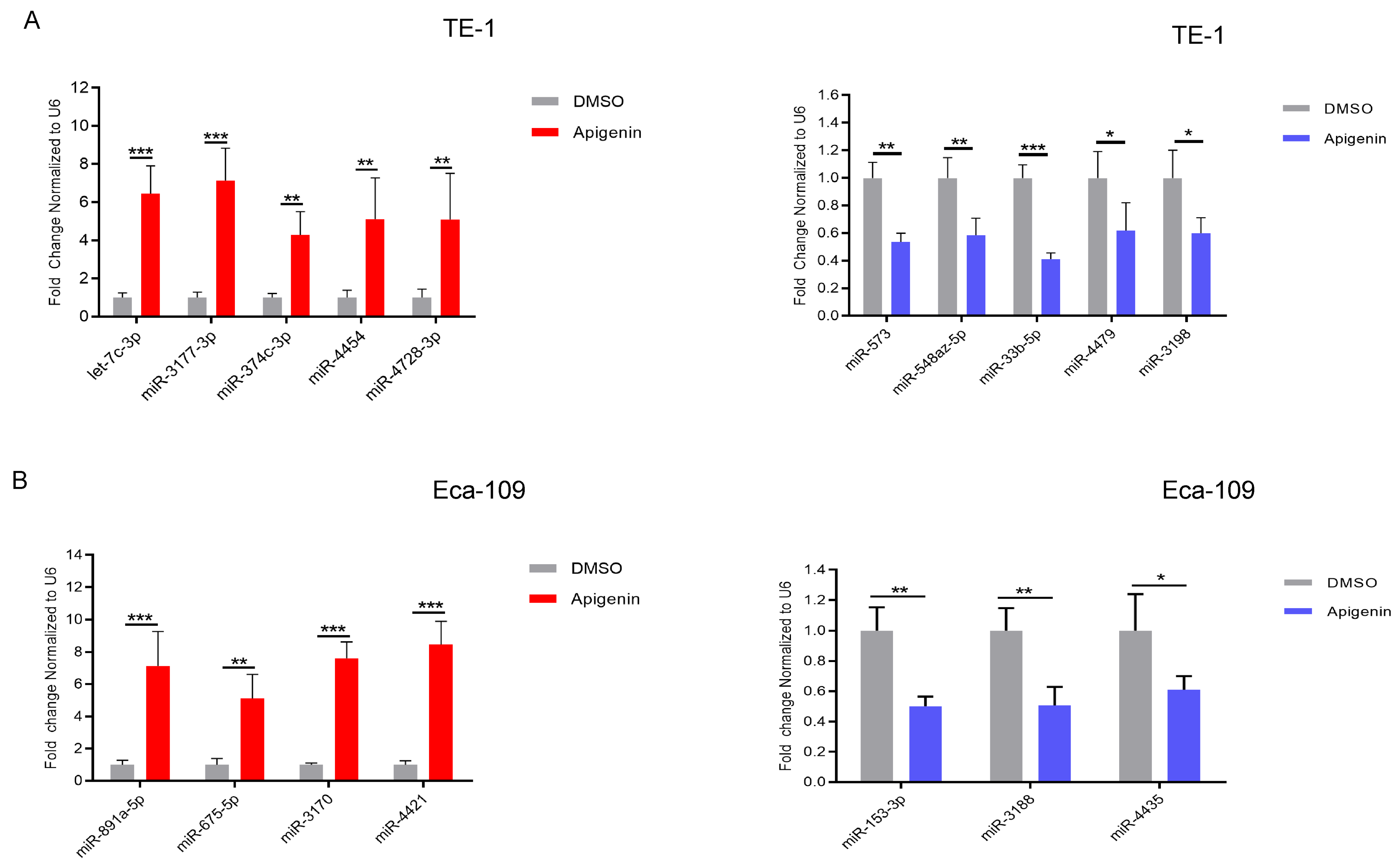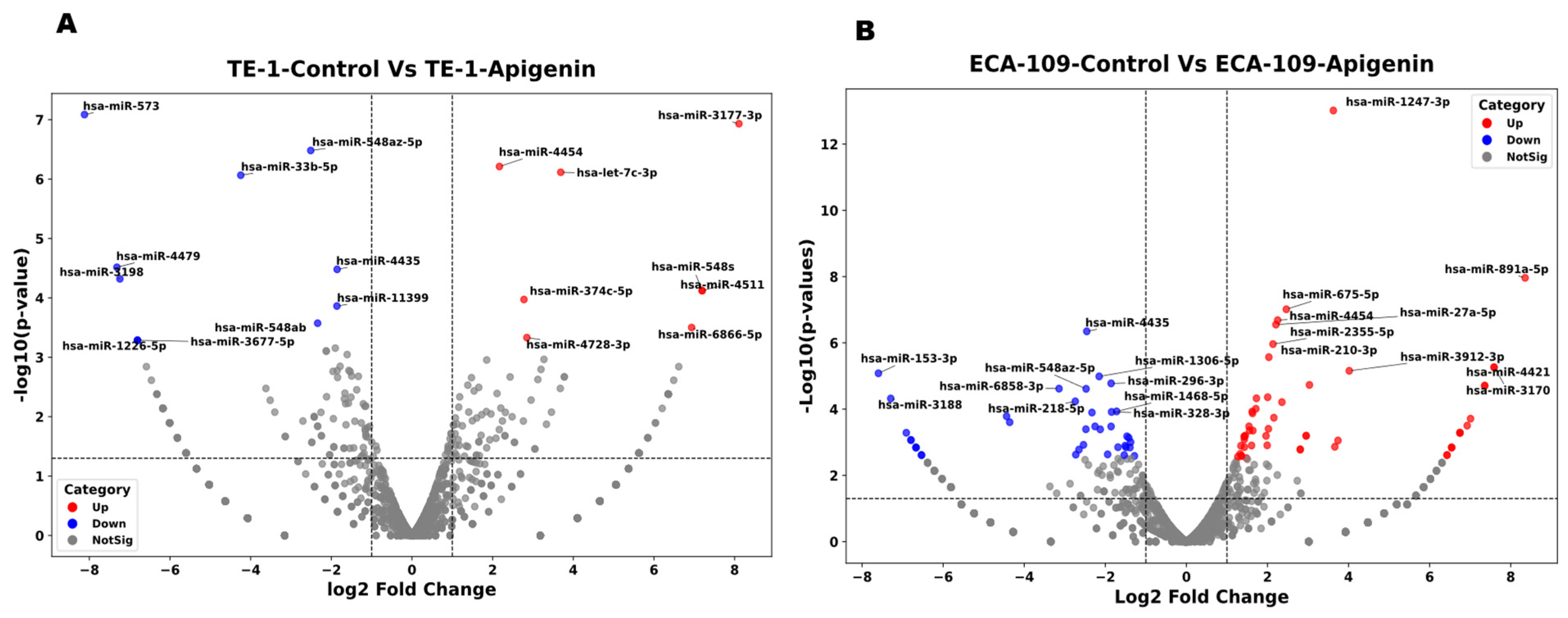 3.5. Apigenin Alters miRNA Expression Profiles in TE-1 and Eca-109 Cells