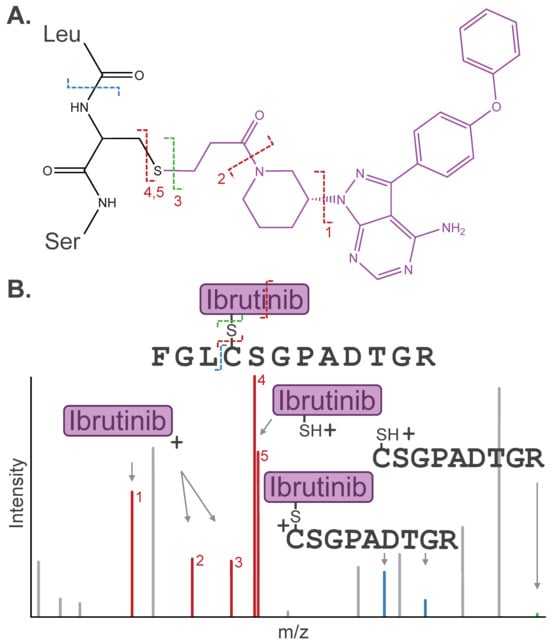 (A) Dissociation pathways observed for cysteine-containing peptide modified by the covalent drug Ibrutinib. (B) Stylized MS/MS spectrum representative of the inhibitor-related fragment ions, including diagnostic ions (red), fragment remnants (blue), or “unmodified” fragment ions (green), that are often detected in a similar intensity range as canonical peptide fragment ions (gray). Diagnostic ions are labeled (1–5) by respective Ibrutinib dissociation pathways depicted in (A).