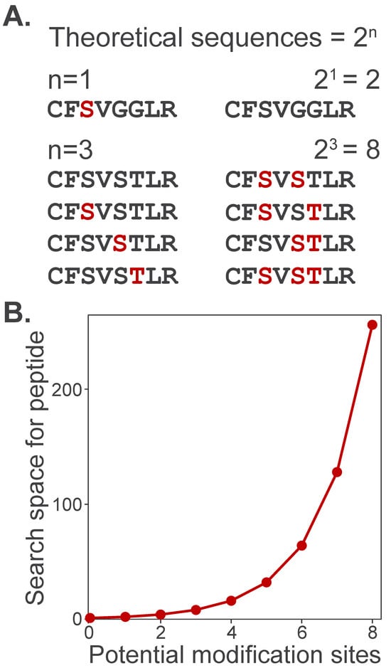 Broad labeling profiles also computationally challenge identification by expanding the search space, or the total number of candidate peptide sequences that can be matched to experimental spectra. To illustrate this, consider how increasing the number of potential modification sites expands the search space for a single peptide. A peptide containing a single modifiable site has only two theoretical sequences: modified or unmodified (Figure 5A). However, as the number of modifiable sites grows, the number of theoretical sequences increases by 2n. Search space grows exponentially as multiple potentially modified amino acids are specified in search algorithms (Figure 5B). This dramatic increase in search space slows search times and expands the number of theoretical sequences as potential matches, thereby increasing the number of false-positive identifications.