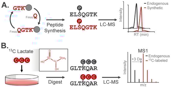 Analytical validation approaches for modified peptides. (A) Synthetic peptide analogs can be used to confirm LC retention, m/z, and MS/MS fragmentation behavior of experimentally observed modified peptides. (B) Metabolic incorporation of isotopically-enriched small molecules can be used to validate endogenous PTMs. Here, the peptide mass will increase by the number of heavy isotopes, while the LC retention and MS/MS fragmentation pattern will match the experimentally observed modified peptide.