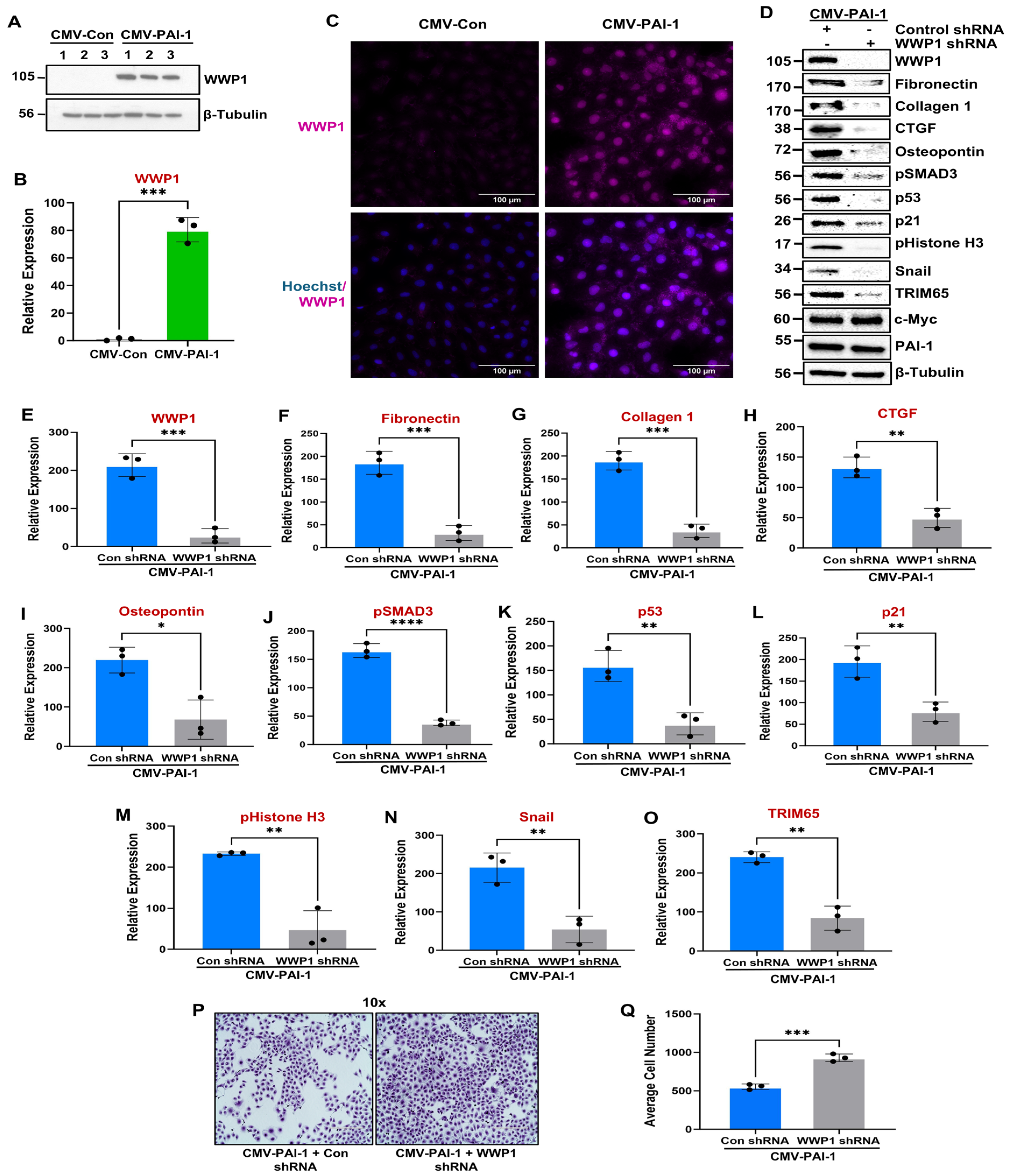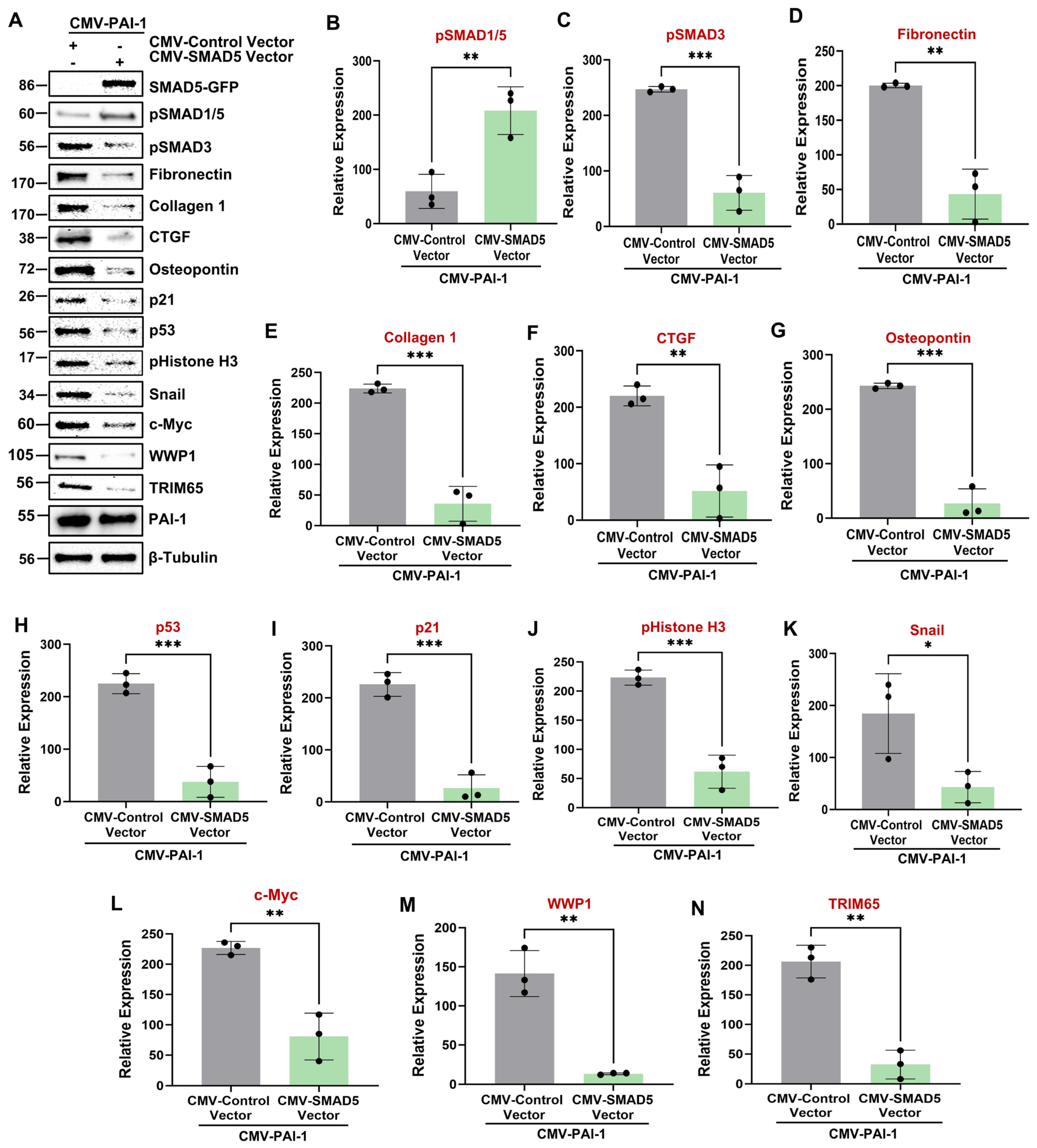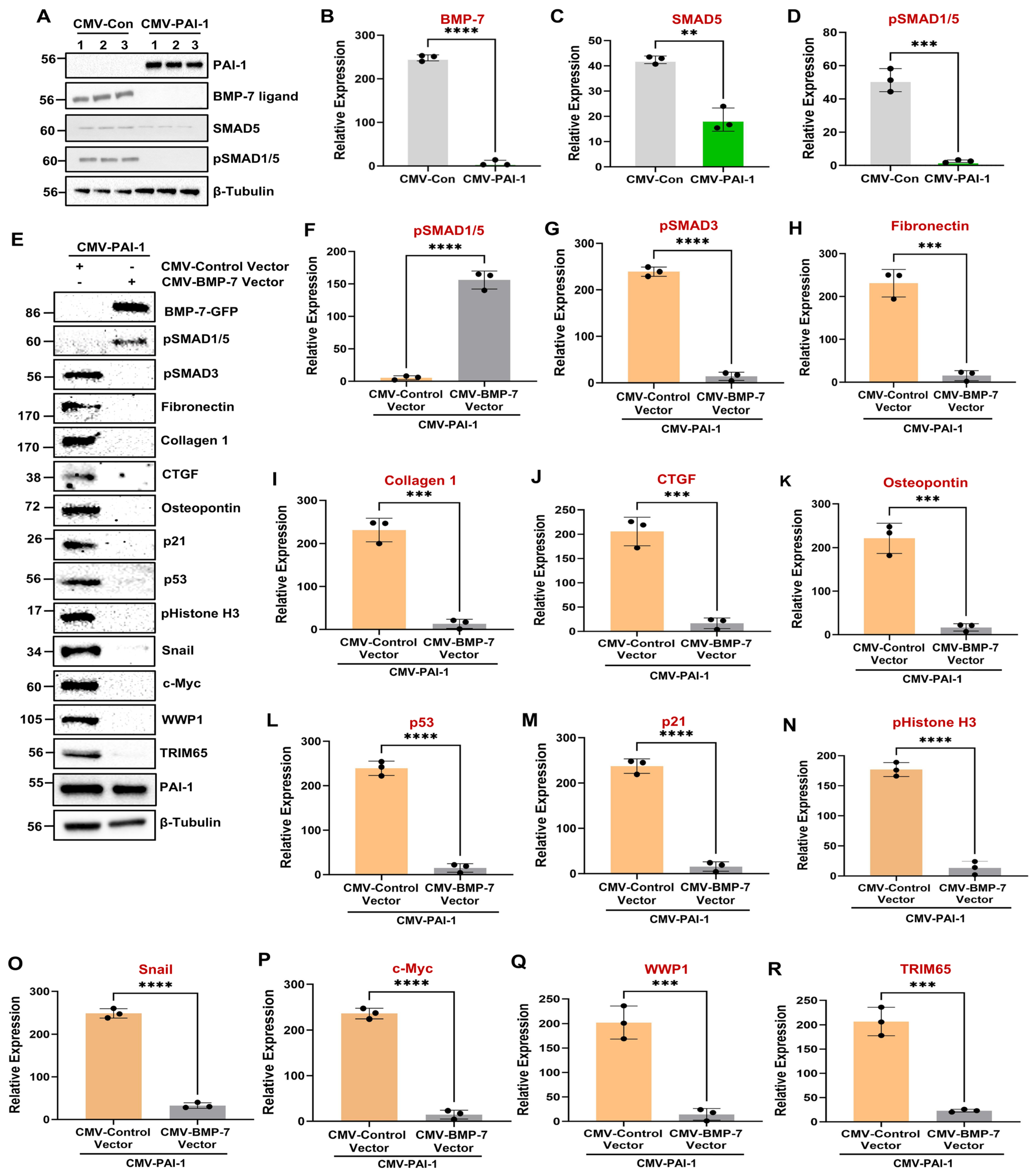 3.6. BMP-7 and SMAD5 Are Upstream Regulators of PAI-1-Driven c-Myc, WWP1, and TRIM65 Upregulation