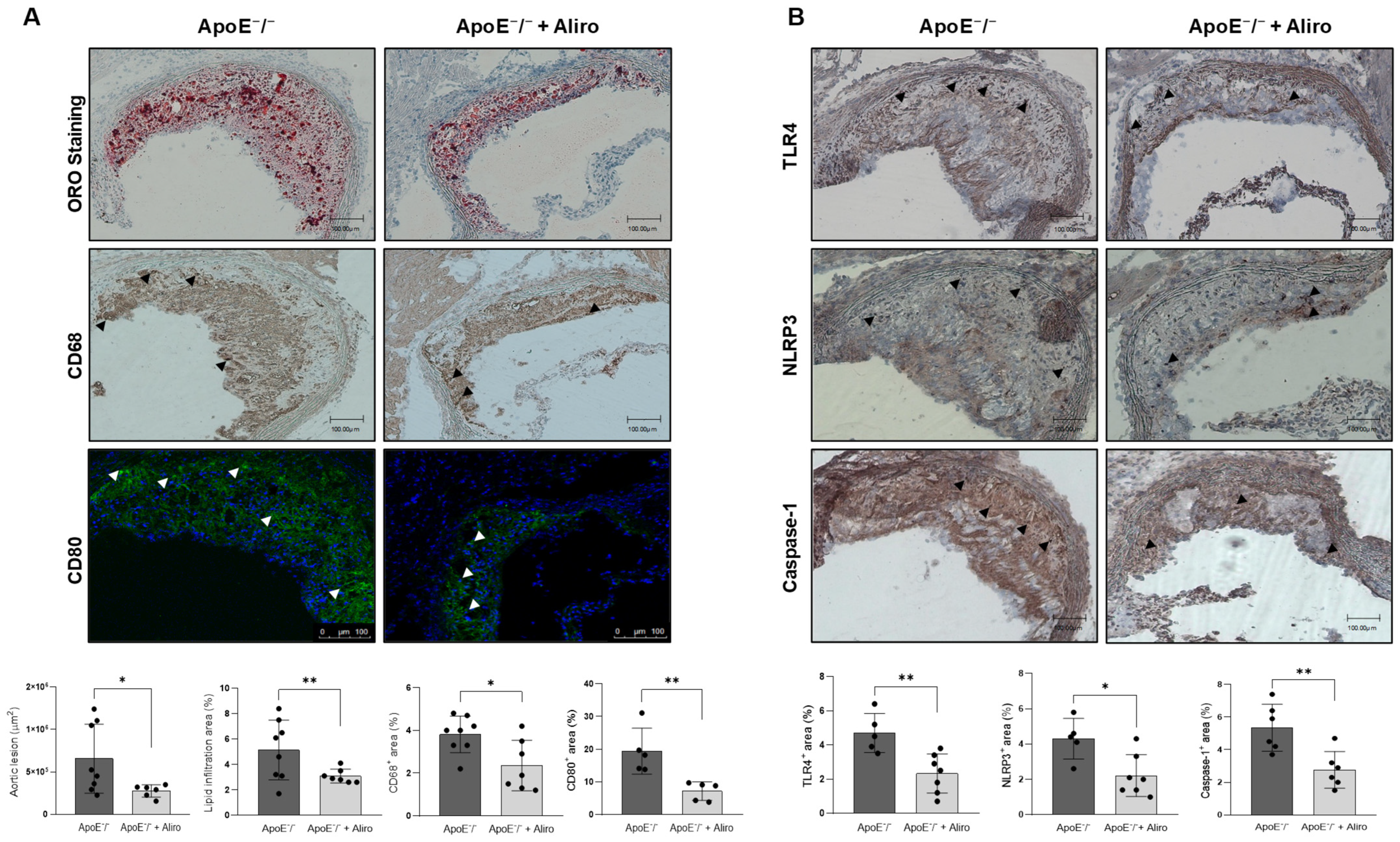 | ApoE−/− (n = 9) | ApoE−/− + Aliro (n = 7) | p-Value | |