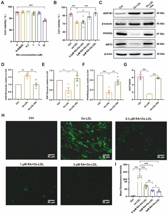 To further validate the protective effects of RA observed in the animal experiments, its potential toxicity and protective effects were investigated at the cellular level using HUVECs. Consistent with the in vivo findings, cell viability assays revealed that RA concentrations between 0.3 and 3 μM had no significant toxicity (Figure 5A). Moreover, pretreatment with RA at 1 and 3 µM significantly attenuated the decrease in cell viability caused by Ox-LDL exposure (Figure 5B). These findings suggested that RA has a favorable safety profile and can protect HUVECs from Ox-LDL-induced damage. To elucidate the underlying mechanisms of RA’s protective effects, the investigation centered on the AKR1B1/SIRT3/PFKFB3 axis. Western blot analysis demonstrated that RA treatment inhibited the Ox-LDL-induced upregulation of AKR1B1 and restored the protein levels of SIRT3 and PFKFB3 (Figure 5C–F). AKR1B1, a key enzyme in the polyol pathway, its upregulation leads to a decrease in the NAD+/NADH ratio. Ox-LDL treatment lowered NAD+/NADH levels, likely due to AKR1B1 overexpression. However, RA treatment effectively restored the NAD+/NADH ratio (Figure 5G), indicating its ability to maintain cellular energy homeostasis via the AKR1B1/SIRT3/PFKFB3 axis.