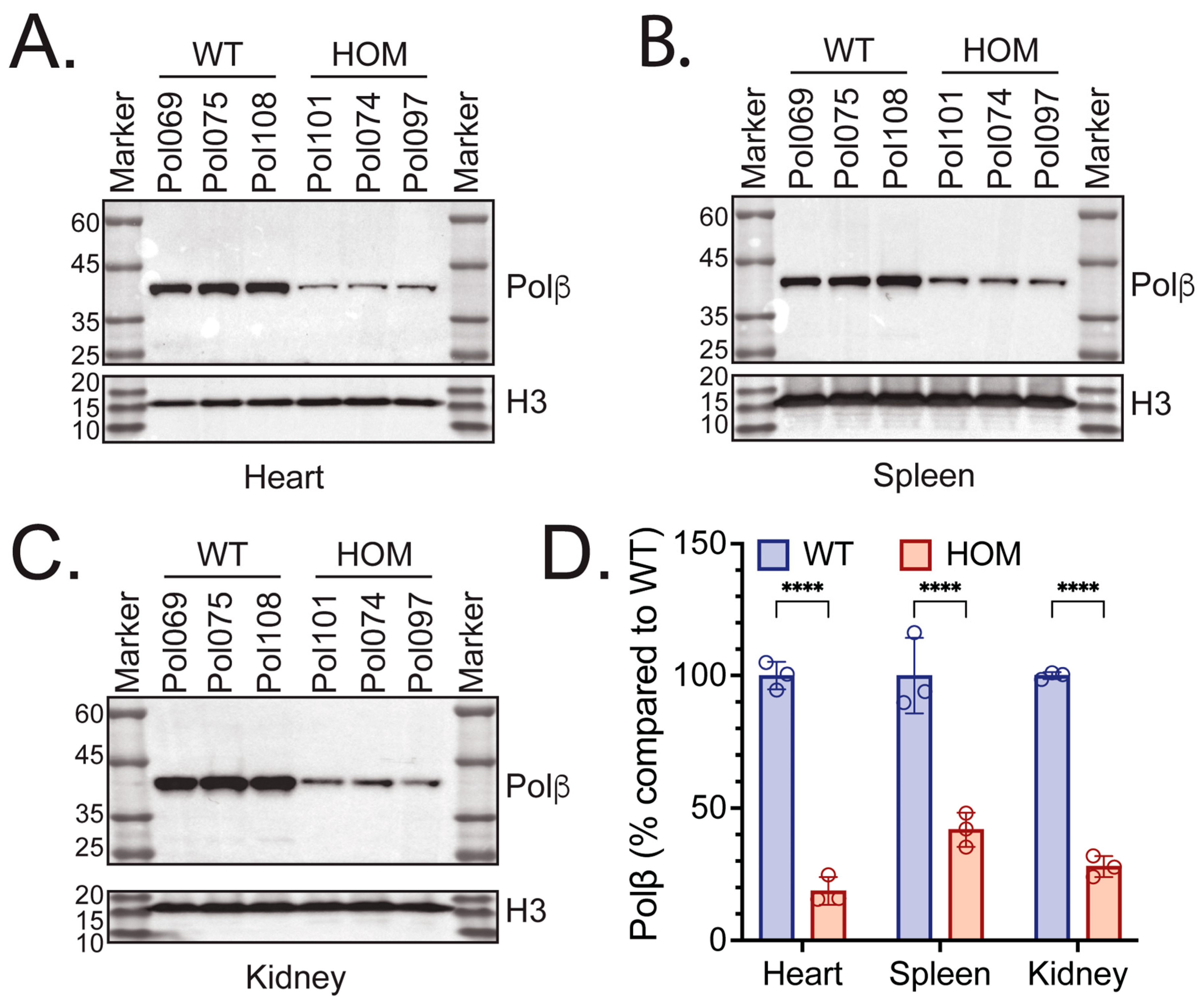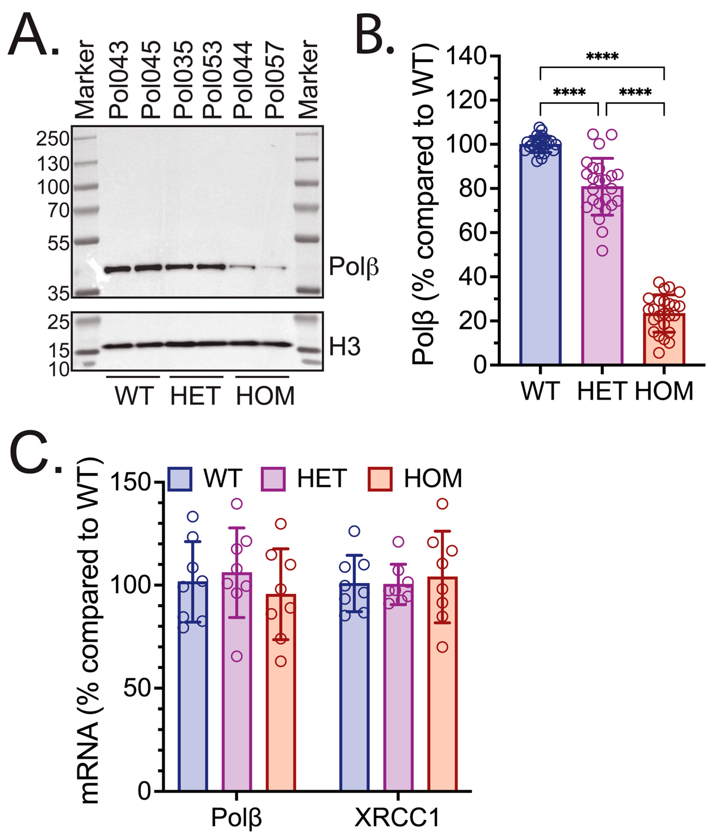 3.1. Polβ Protein Levels Were Diminished in Various PolβL301R-V303R/L301R-V303R Mouse Tissues