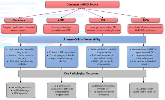 mtROS constitute a central pathogenic axis across the major ocular neurodegenerative disorders, yet their roles vary according to cellular context, metabolic architecture, and disease-specific stressors. Although glaucoma, AMD, DR, and LHON share core features of mitochondrial dysfunction, including impaired oxidative phosphorylation, mtDNA instability, and redox disequilibrium, the magnitude, localisation, and temporal dynamics of mtROS production differ across retinal cell types [11,20].
