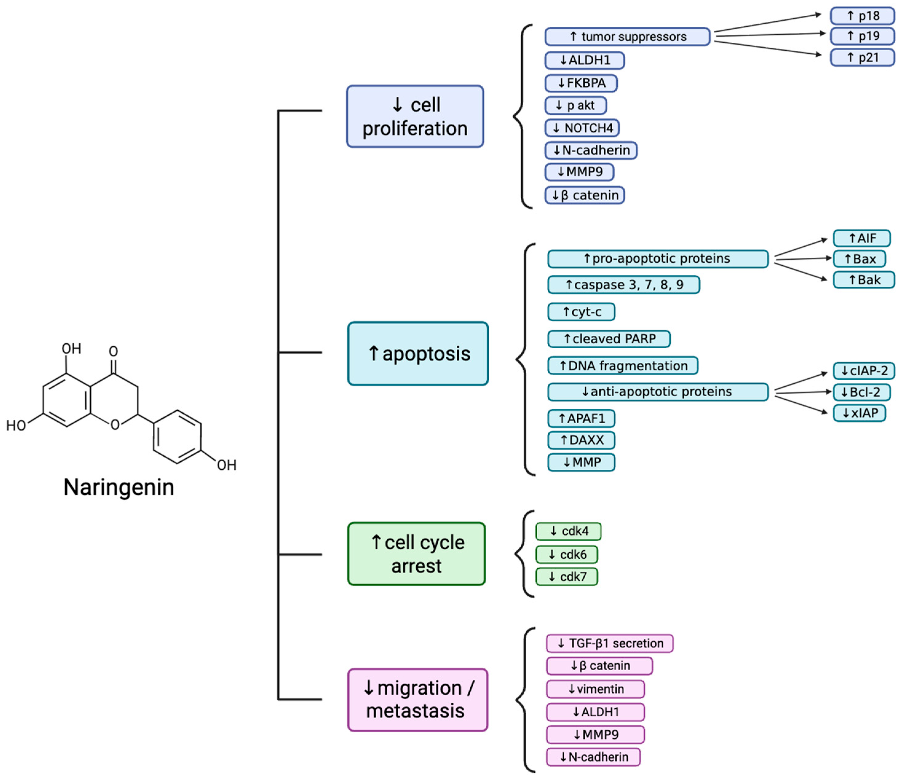 22]. Nar increased the proportion of cells in S-phase and G2/M phase while decreasing the proportion of cells in G0/G1-phase of the cell cycle in both breast cancer cell lines. Flow cytometry revealed an increase in early apoptosis, late apoptosis, and necrosis of breast cancer cells treated with Nar. Western blot analysis revealed decreased phosphorylation of IκB, an upstream mediator of NF-κB function, and decreased levels of NF-κB p65 protein, indicating decreased NF-κB activation and nuclear translocation. Additionally, Nar treatment decreased phosphorylated Akt levels in breast cancer cell lines. qRT-PCR analysis revealed a significant increase in tumor suppressor (p18, p19, and p21) mRNA levels and decreased cell cycle progression (cyclin-dependent kinase (Cdk) 4, Cdk6, and Cdk7) mRNA levels with Nar treatment. Additionally, Nar treatment increased pro-apoptotic mRNA levels (Bak, caspases-3, 7, 8, 9, apoptosis-inducing factor (AIF), and Bax), and decreased anti-apoptotic mRNA levels (Bcl2, xIAP, and c-IAP-2). Overall, these data indicate a strong anticancer potential of Nar in breast cancer cells while sparing normal human fibroblast cells.