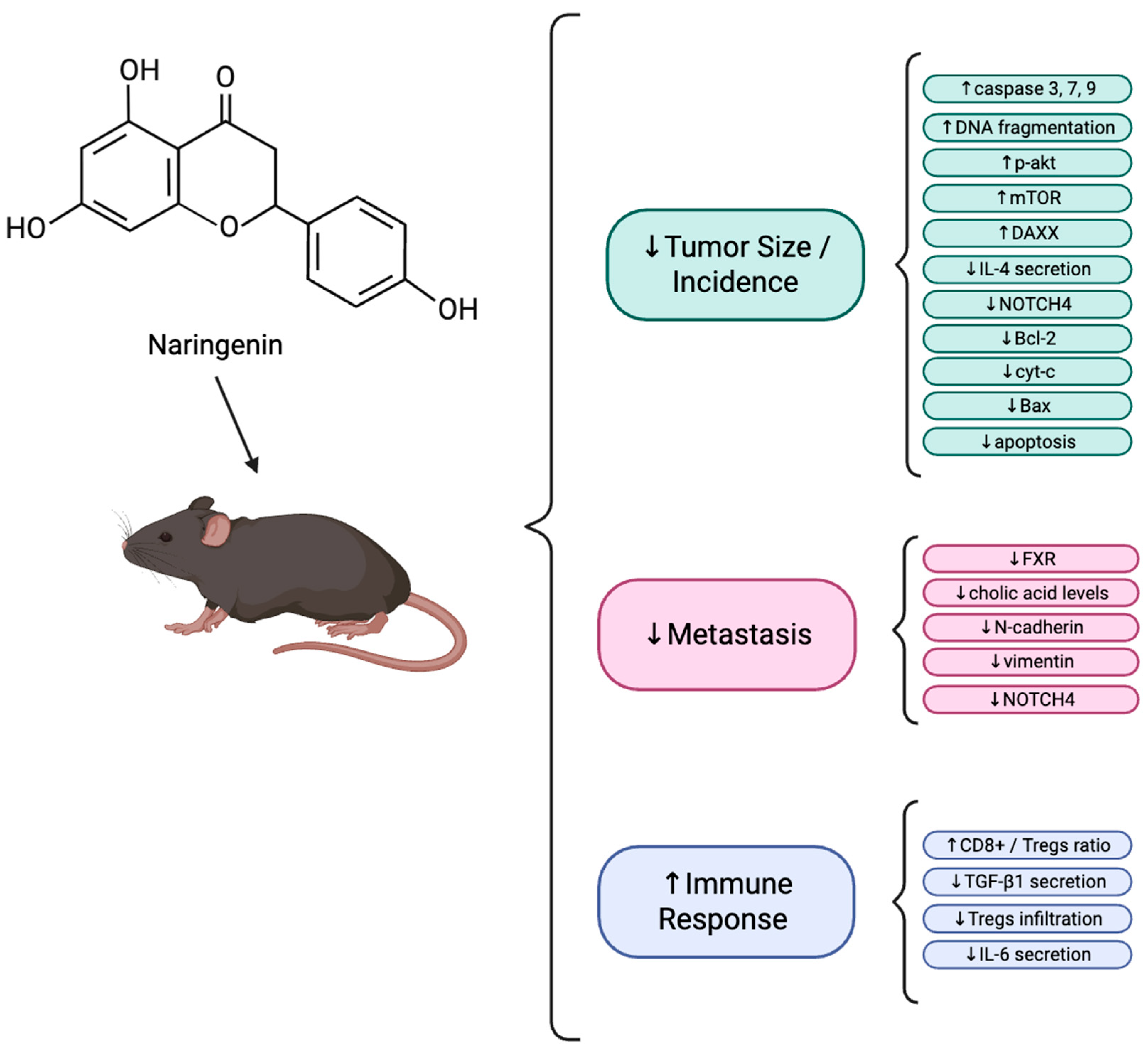 28]. High-dose Nar significantly decreased lymph node and pulmonary metastases. Nar treatments decreased proliferating cell nuclear antigen (PCNA)-positive cells, DNA fragmentation, and increased caspase 3 and 9 activity in a dose dependent manor, indicating increased apoptosis [