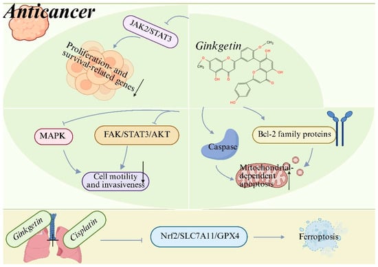 Anticancer mechanisms of ginkgetin (GK). GK suppresses tumor cell proliferation, survival, migration and invasiveness by inhibiting oncogenic signaling pathways, including JAK2/STAT3, MAPK and FAK/STAT3/AKT. Meanwhile, GK triggers mitochondrial-dependent apoptosis through modulation of Bcl-2 family proteins and activation of caspases. Moreover, GK enhances the anticancer efficacy of cisplatin by promoting ferroptosis via suppression of the Nrf2/SLC7A11/GPX4 axis, thereby enhancing chemosensitivity and overcoming drug resistance. Created with BioRender. Sun, Z. (2026) https://app.biorender.com/illustrations/696f4198a93f5e17600f3c3a?slideId=f83d8a3d-b04f-4cfd-8f2c-3d76a99bbc30 (accessed on 20 March 2026).