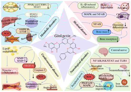 Therapeutic potential of ginkgetin (GK) across disease systems: (1) Metabolic disorders: GK suppresses adipogenesis, hepatic steatosis and fibrosis by inhibiting STAT5 and STAT1/STAT3 signaling, regulating macrophage polarization, and reduces oxidative stress, inflammatory responses and extracellular matrix deposition via the AMPK/mTOR pathway; (2) Cardiovascular diseases: GK improves lipid metabolism, attenuates vascular inflammation and oxidative stress, reduces cardiomyocyte apoptosis, and promotes angiogenesis through modulation of MMP-2/9, VEGF-A and caspase-3; (3) Neurological disorders: GK alleviates neuroinflammation by inhibiting NF-κB, JAK/STAT and TLR4 pathways, preserves mitochondrial integrity and iron homeostasis, and promotes peripheral nerve regeneration via the PlGF/p38 MAPK axis; (4) Skeletal disease: GK suppresses IL-1β-induced inflammation and extracellular matrix degradation, restores autophagic balance, inhibits chondrocyte apoptosis and osteoclast differentiation, reduces bone resorption, and preserves bone mass. Created with BioRender. Sun, Z. (2026) https://app.biorender.com/illustrations/696c580e3c5ff191ef28e1d6?slideId=7bbb521c-814e-457d-9b24-ca82bd9411ee (accessed on 20 March 2026).