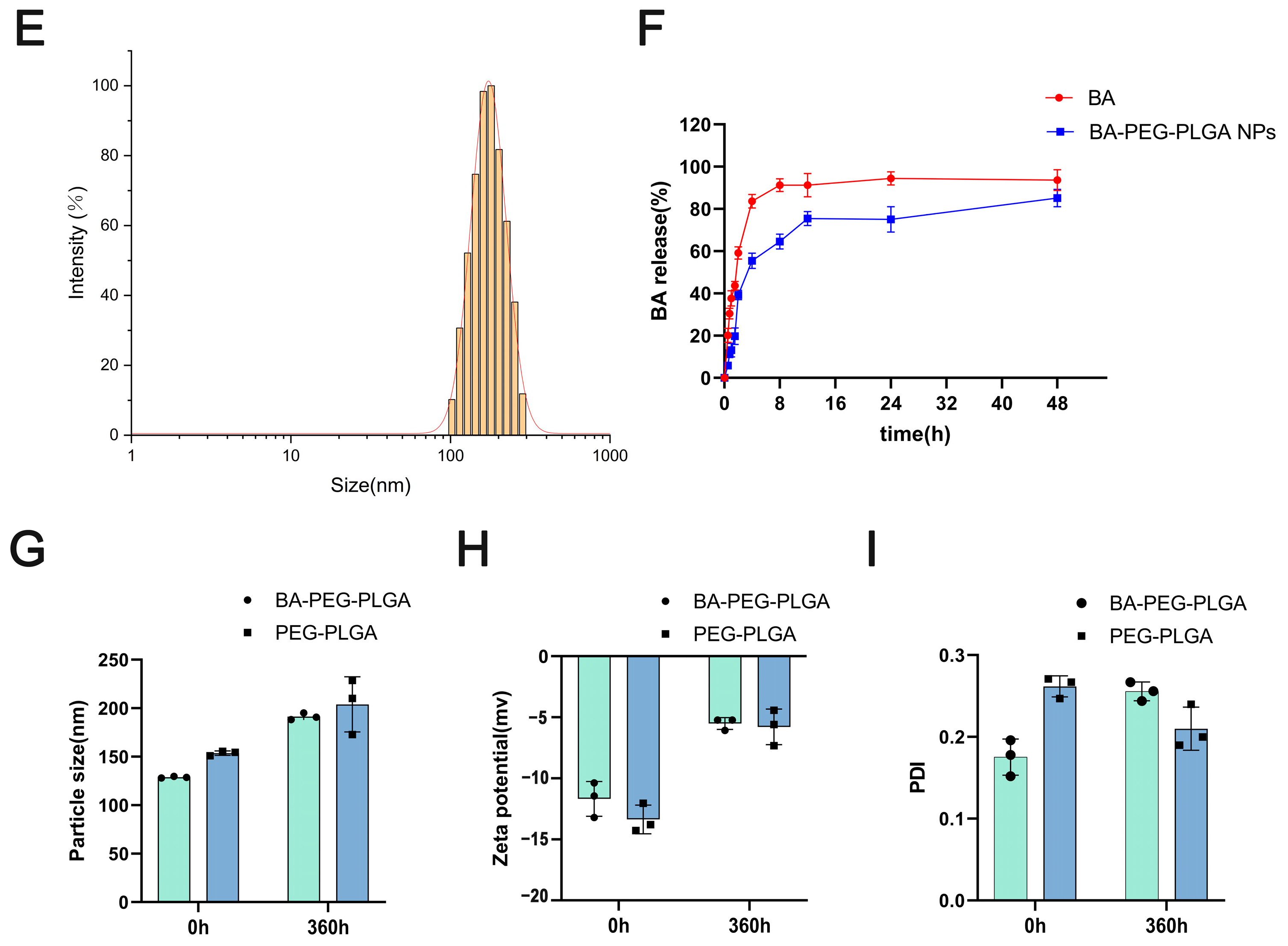 2.4. Stability and Release of BA-PEG-PLGA NPs