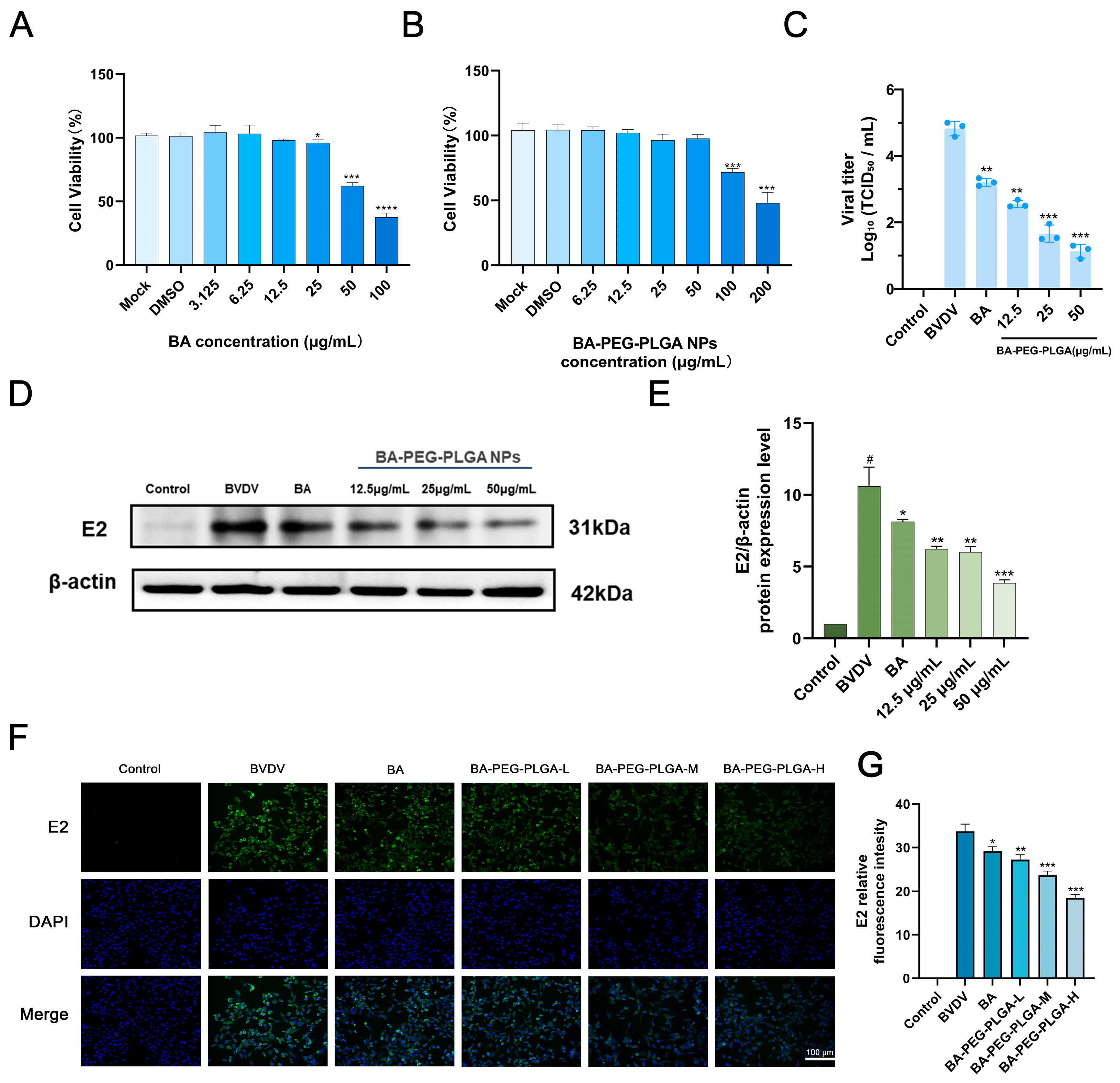 3.2. BA-PEG-PLGA NPs Inhibit BVDV Infection in MDBK Cells