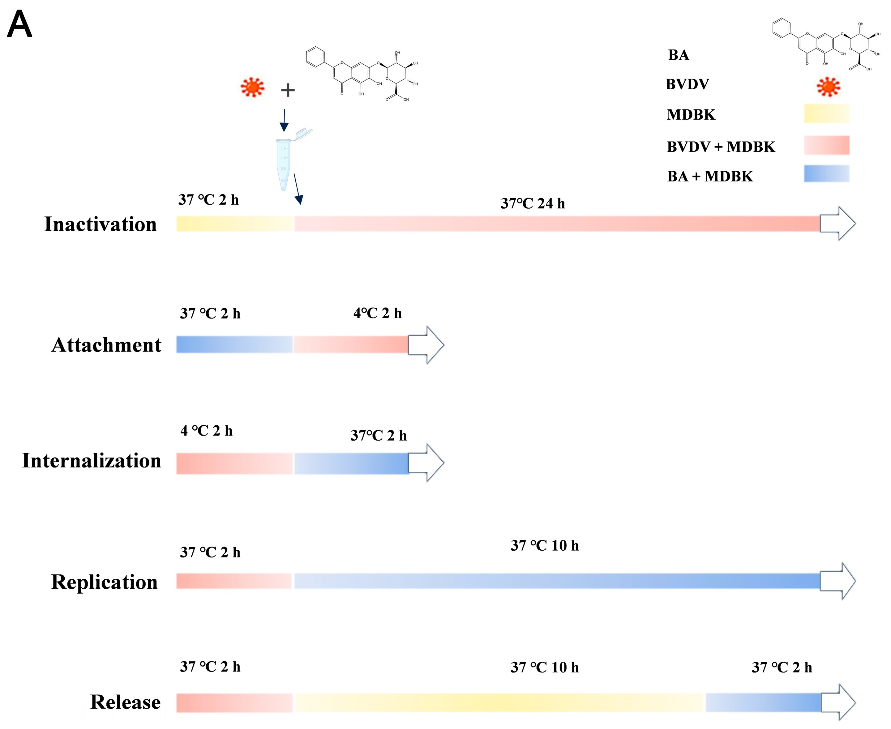 3.3. BA Inhibiting BVDV Replication and Release During the Viral Life Cycle