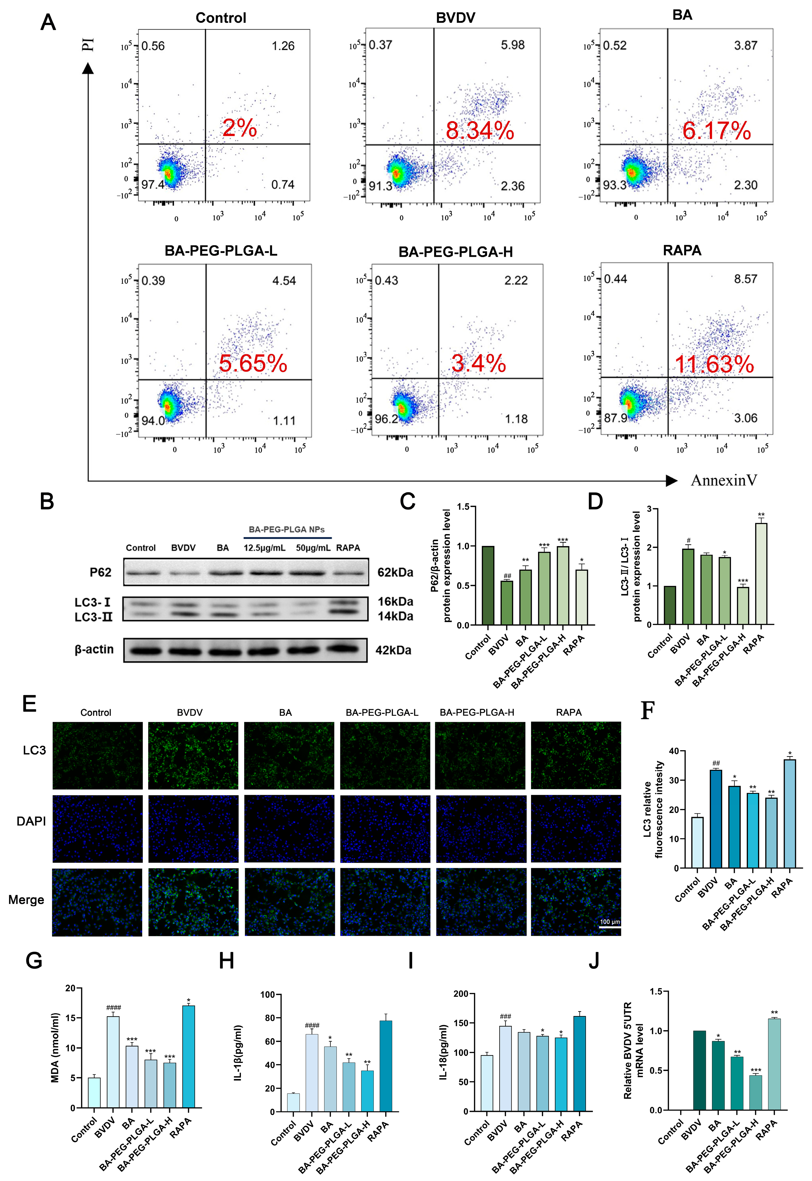 3.5. BA-PEG-PLGA NPs Modulate BVDV-Induced Autophagy to Suppress Inflammatory Cytokine Expression