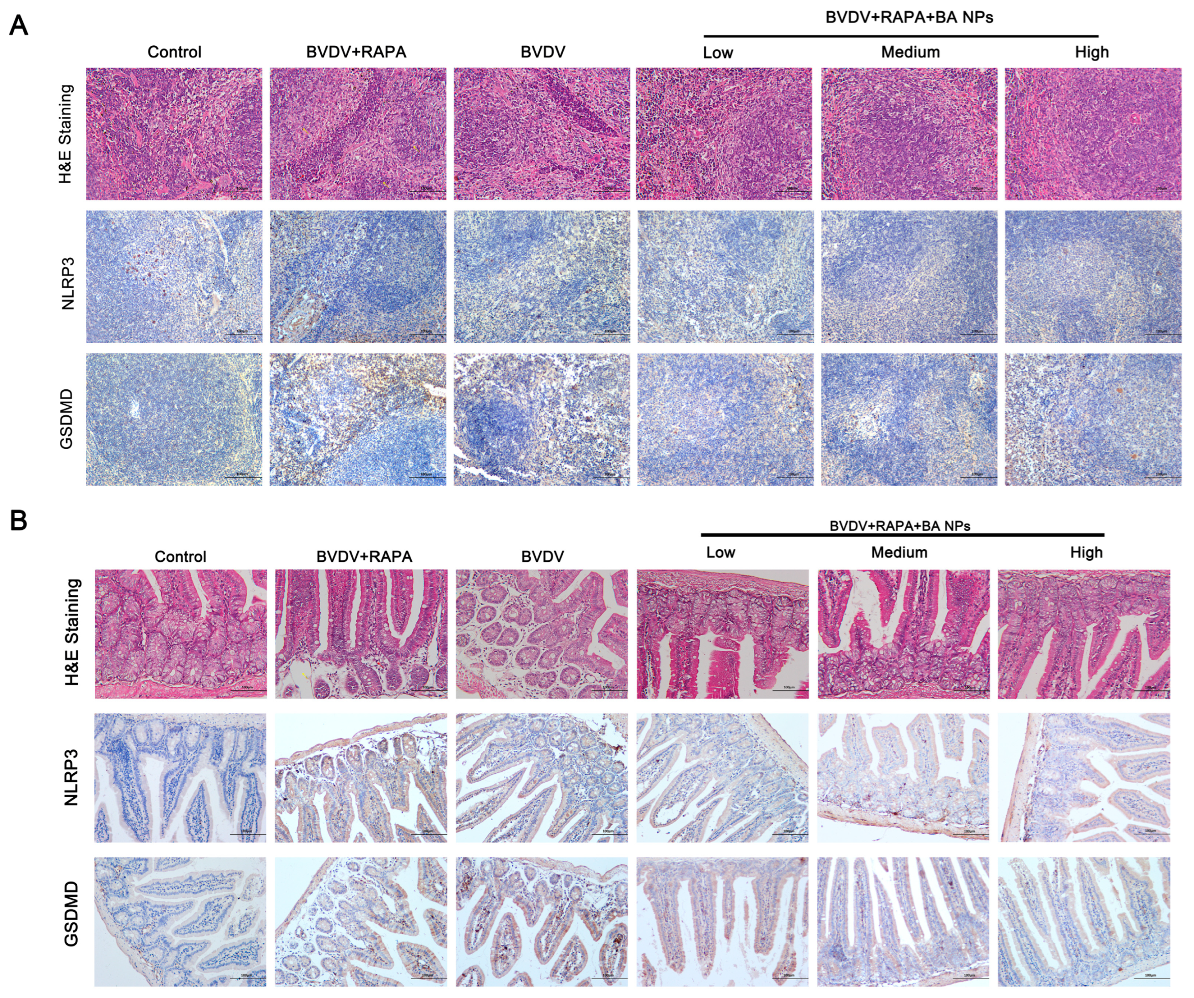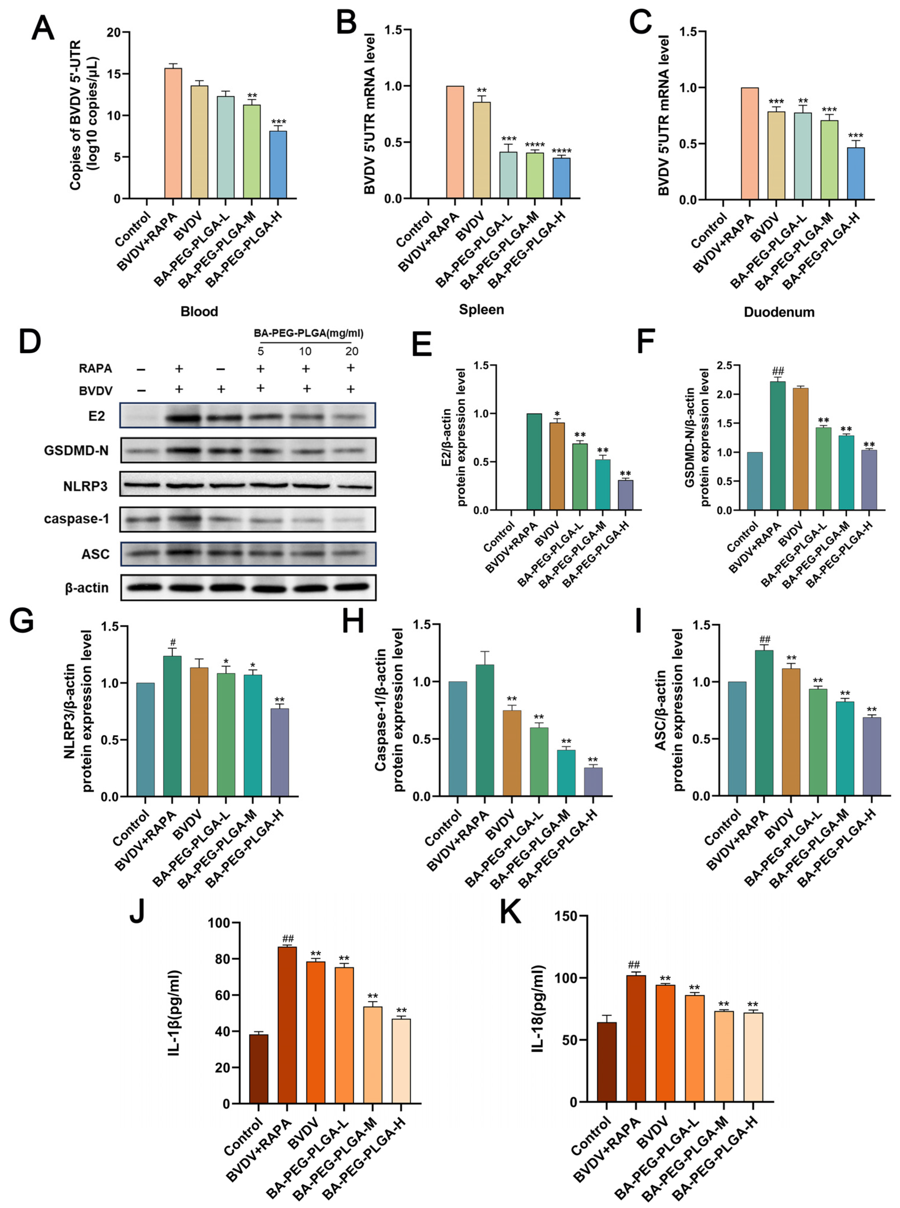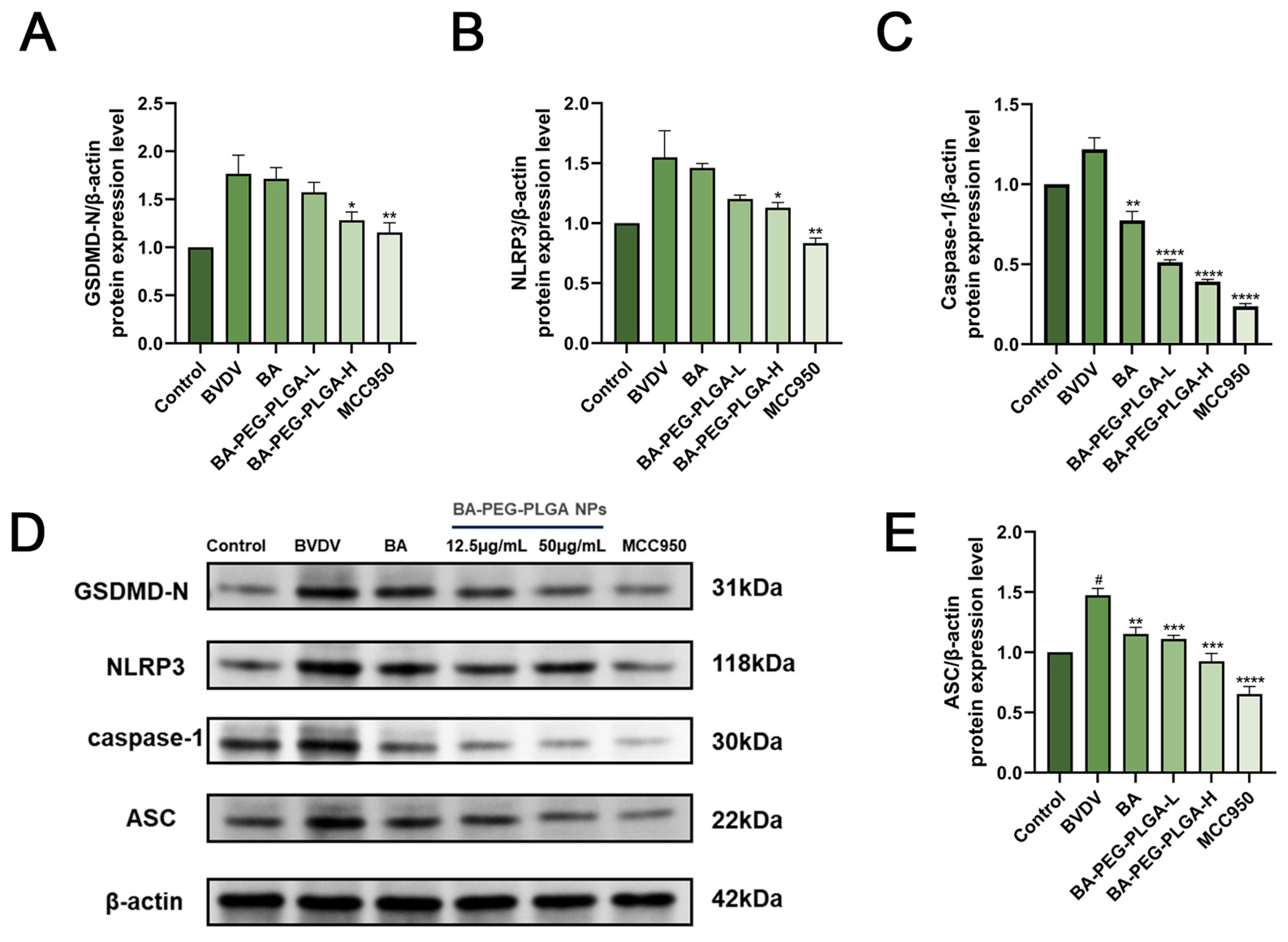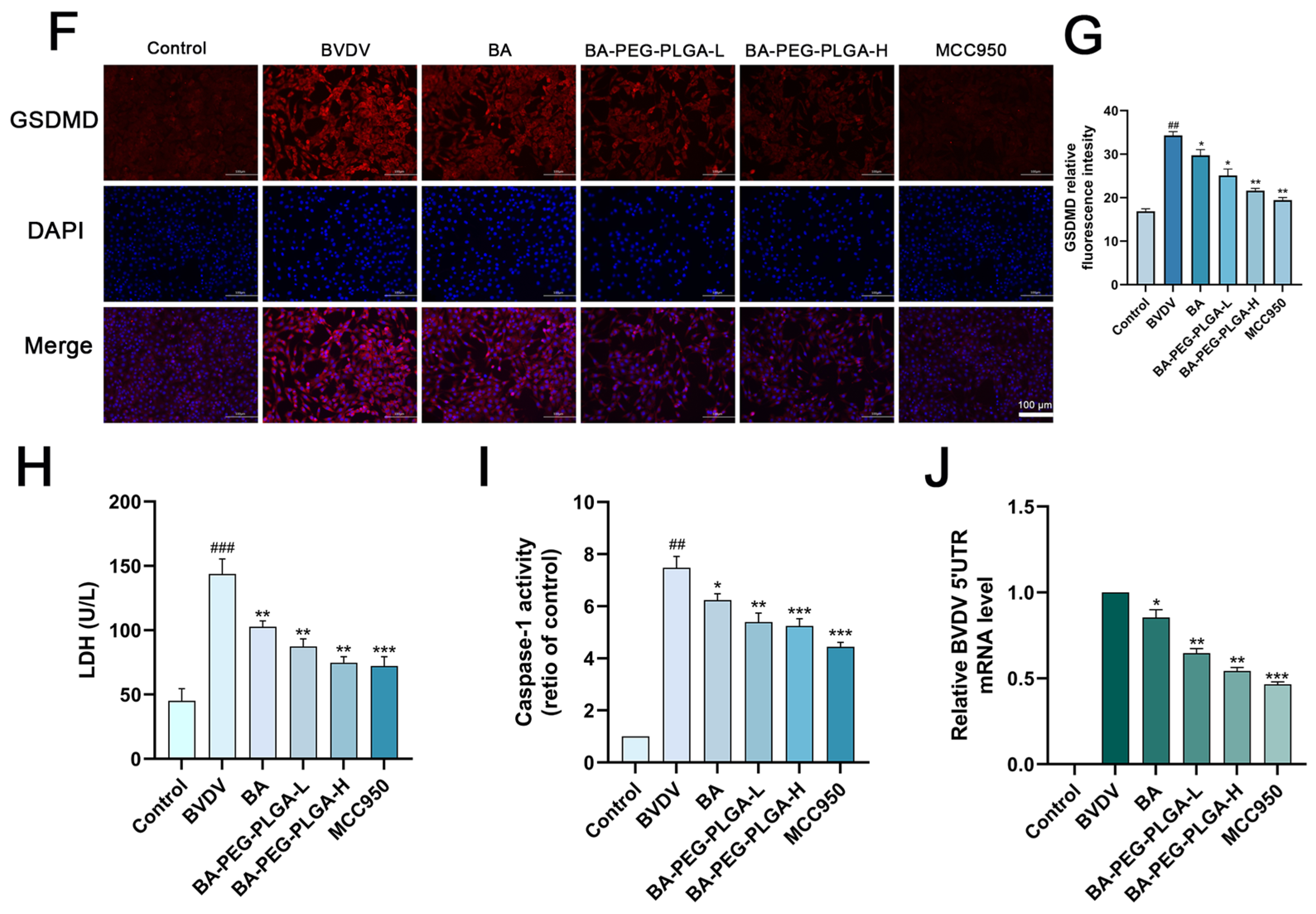 3.8. BA-PEG-PLGA Modulation of NLRP3 Inflammasome Reduces Viral Load and Alleviates Virus-Induced Tissue Damage in BVDV-Infected Mice